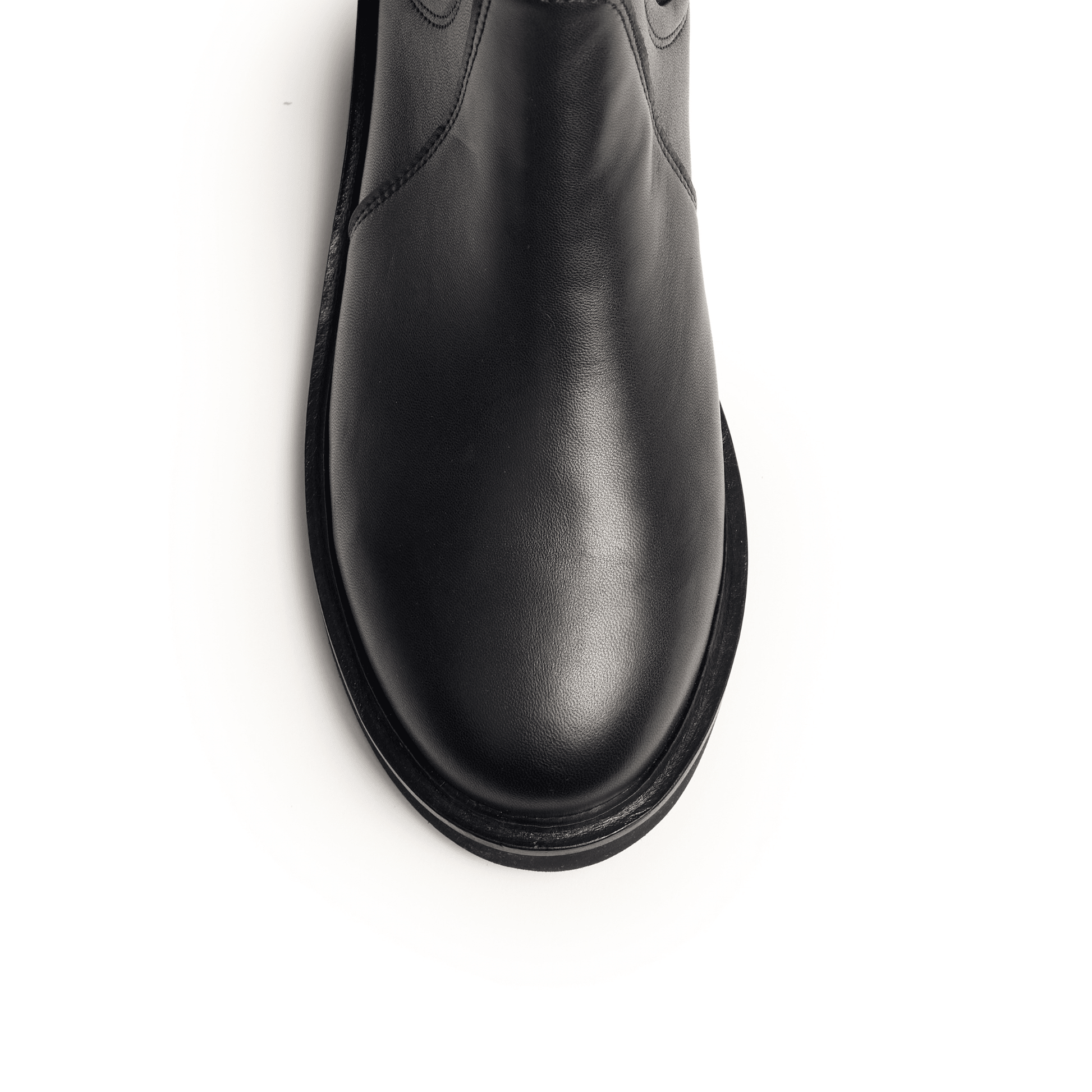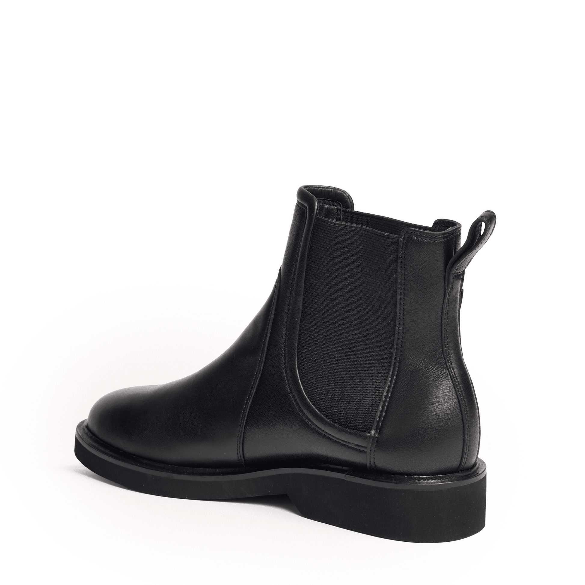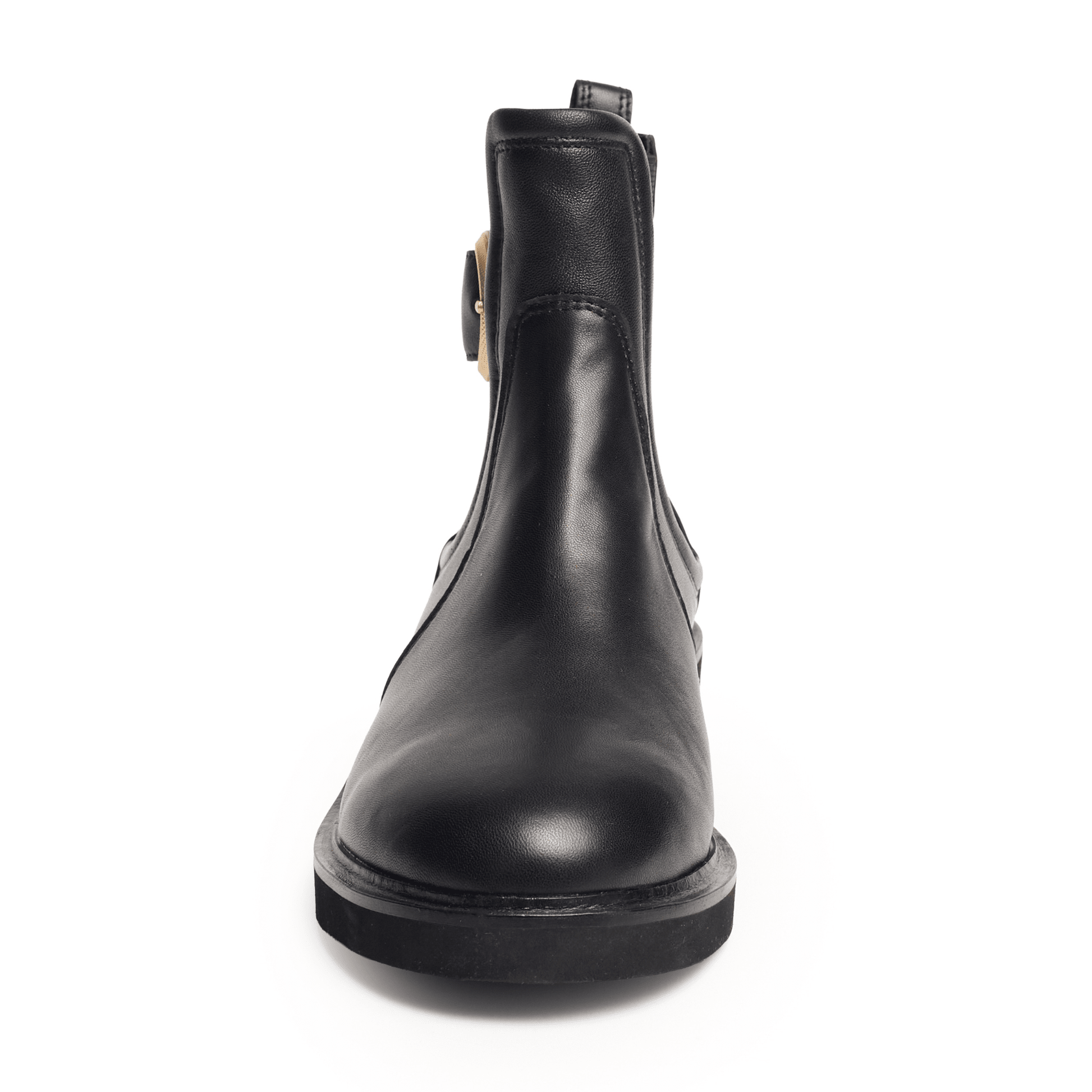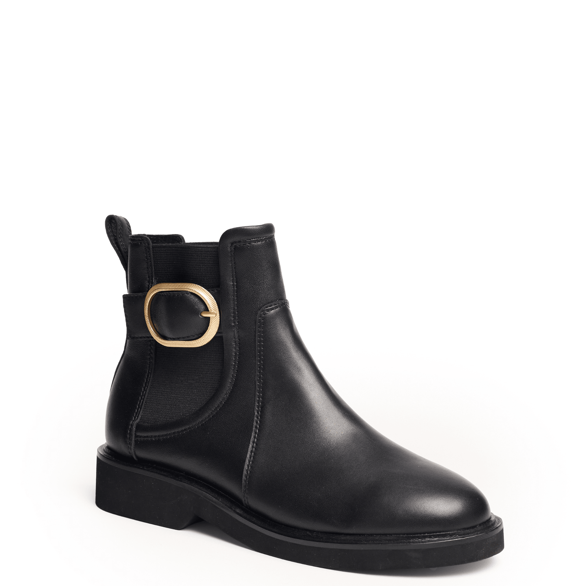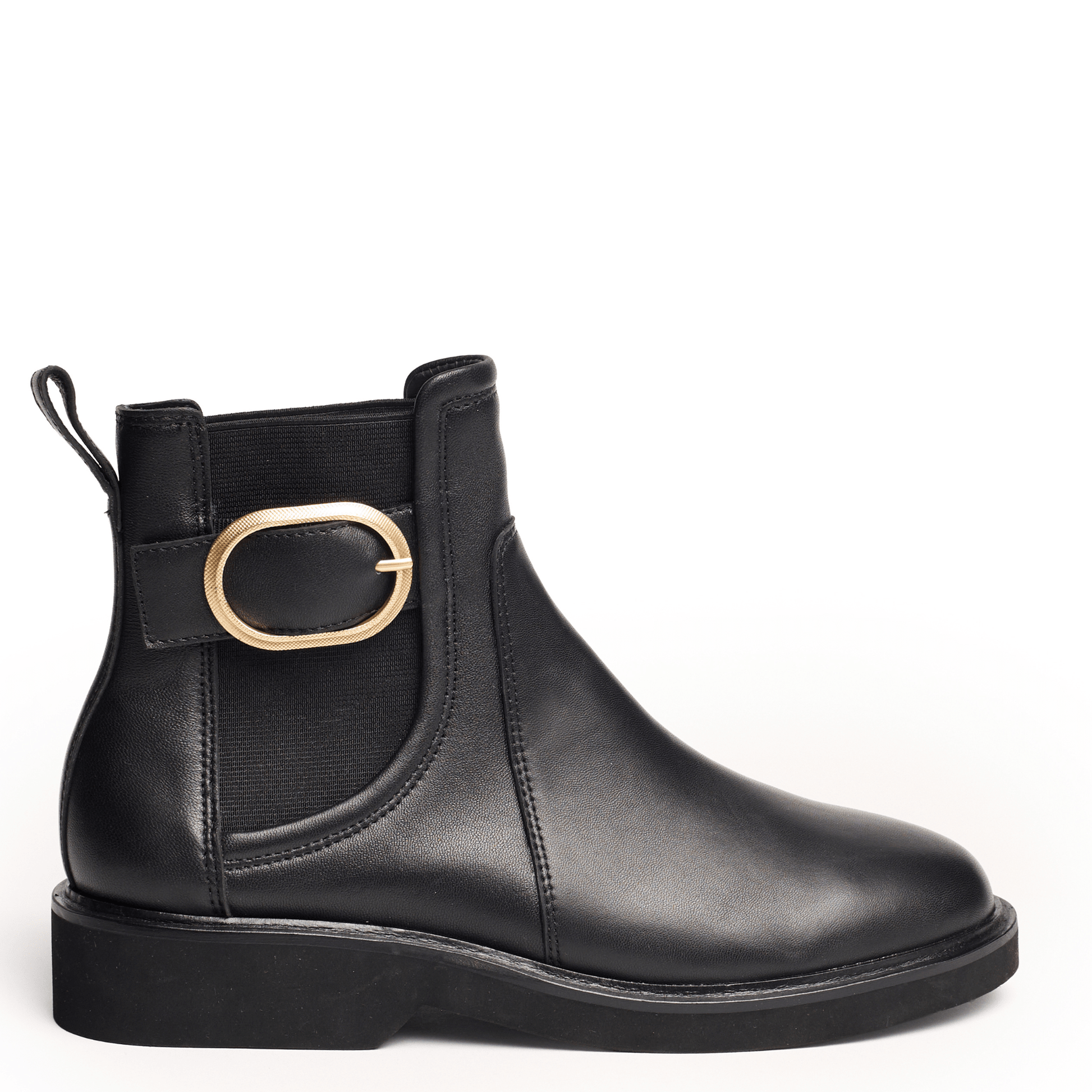 This sleek leather ankle boot features a modern gold buckle detail and a refined round toe silhouette. Designed with an elastic stretch side panel for effortless slip-on wear and a low stacked heel for all-day comfort.