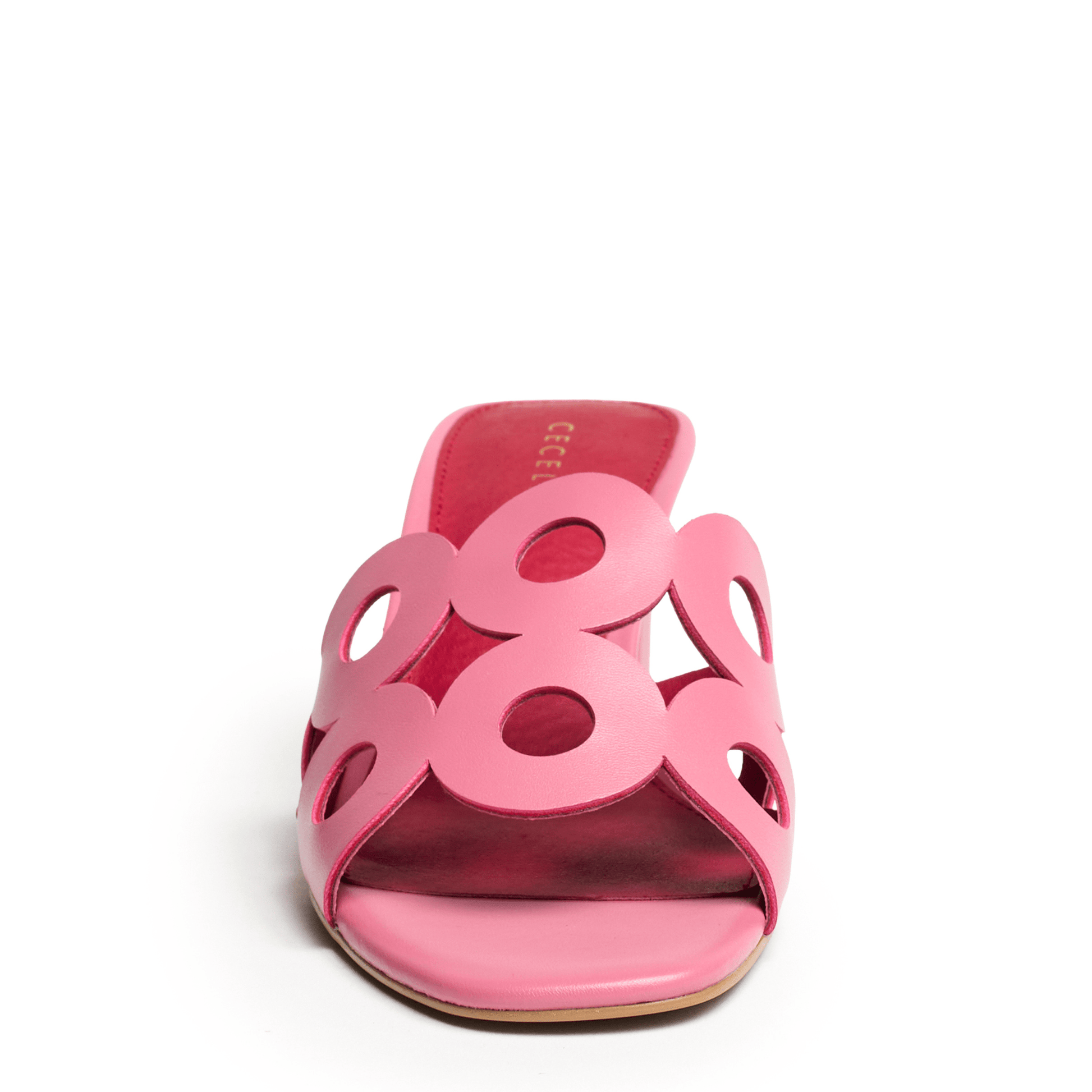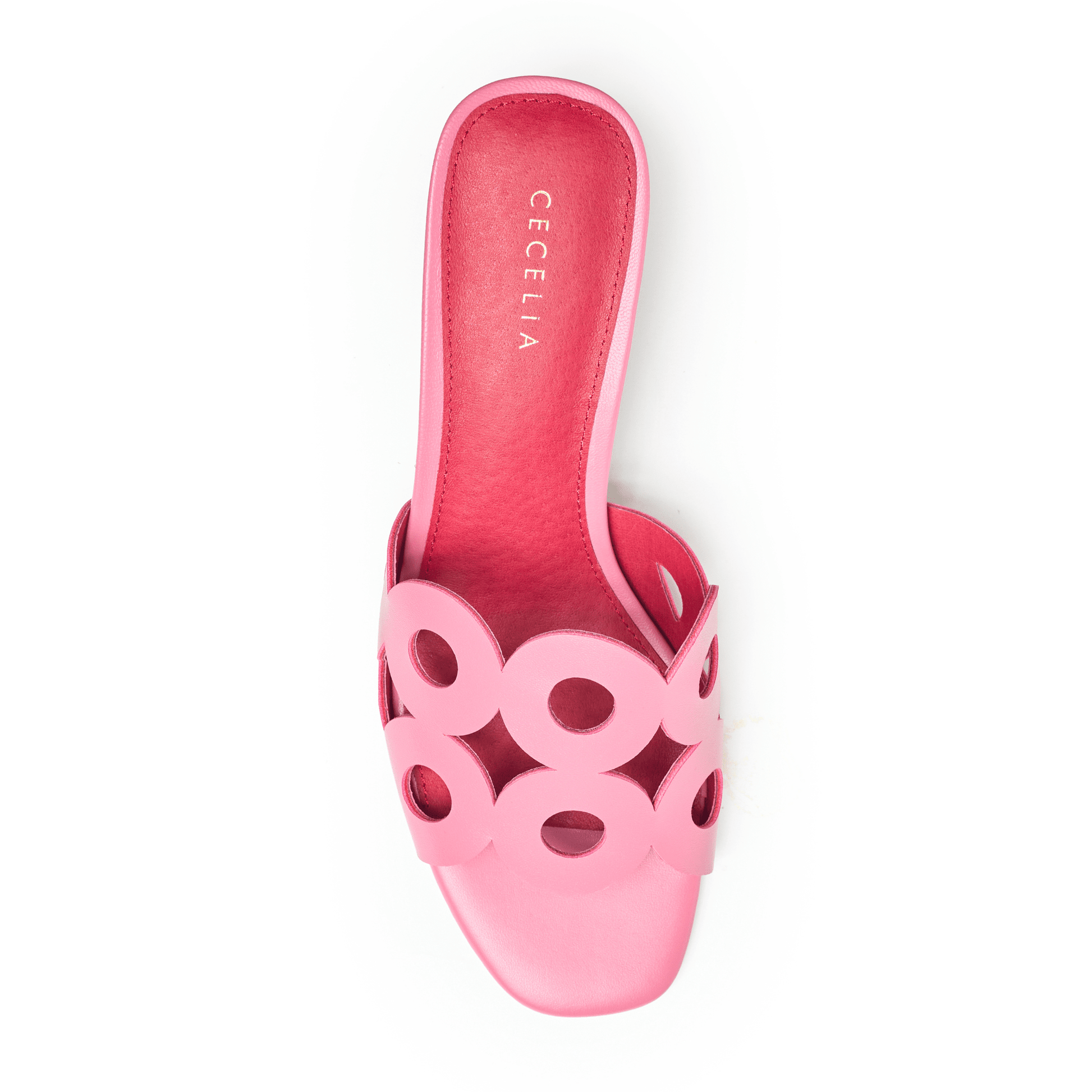 Circular cutouts create visual intrigue on a leather slide sandal framed by a squared-off toe and tapered heel.