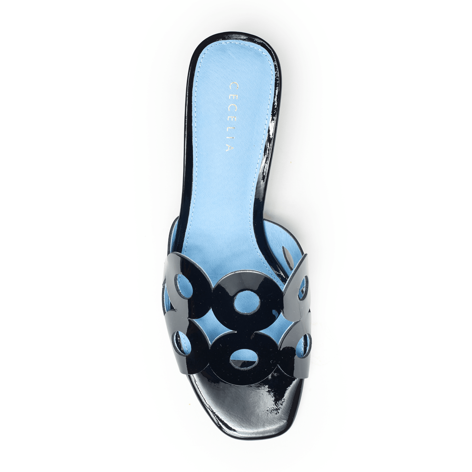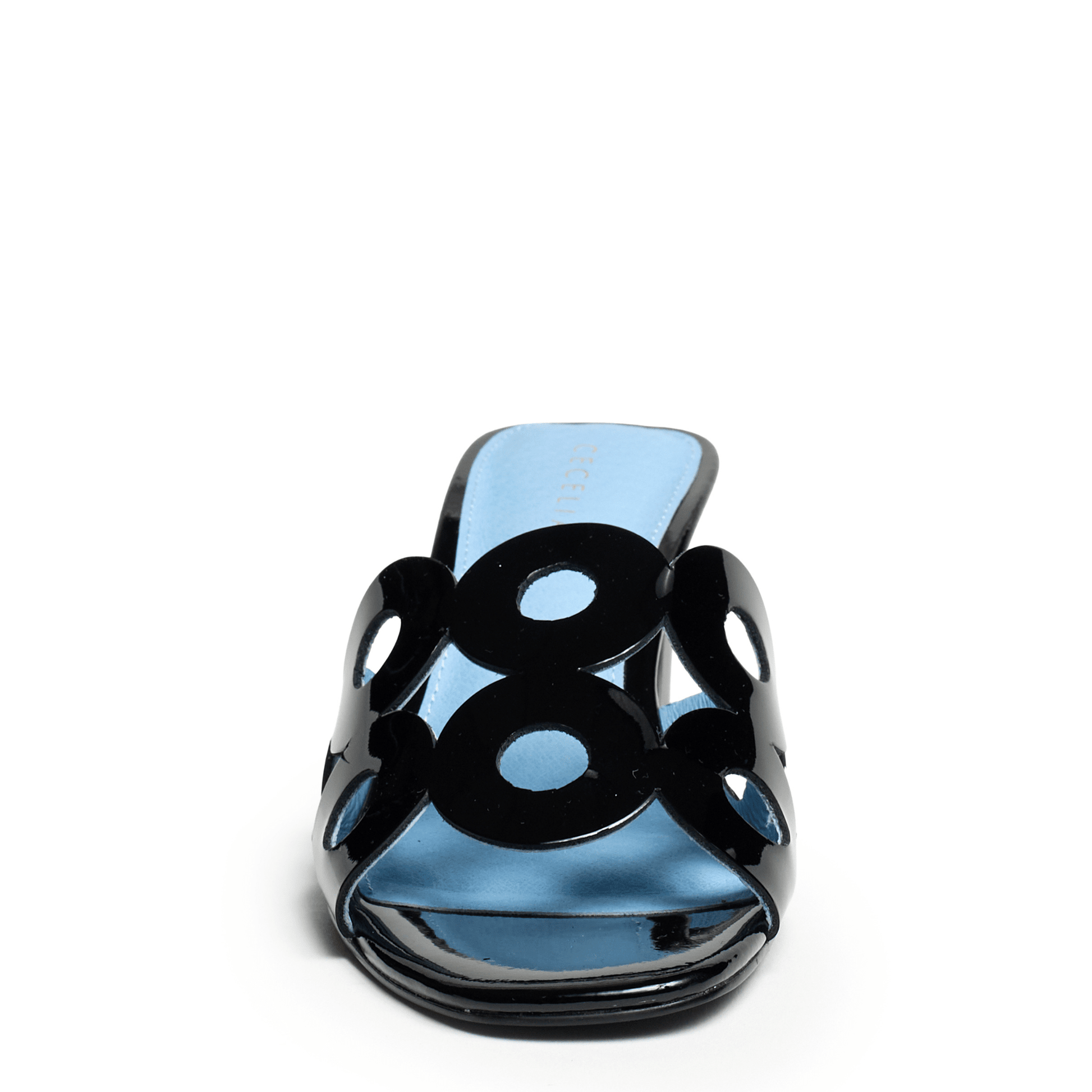 Circular cutouts create visual intrigue on a leather slide sandal framed by a squared-off toe and tapered heel.