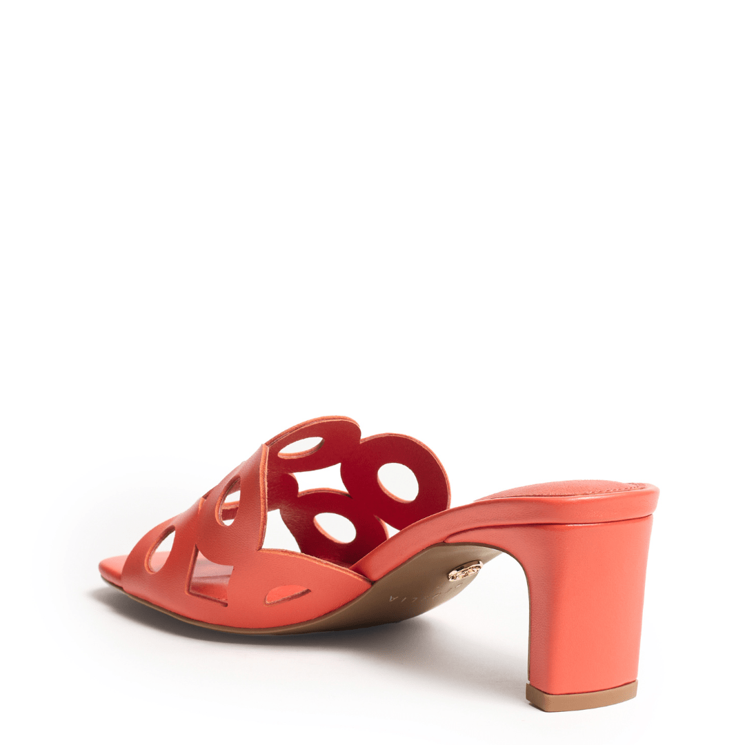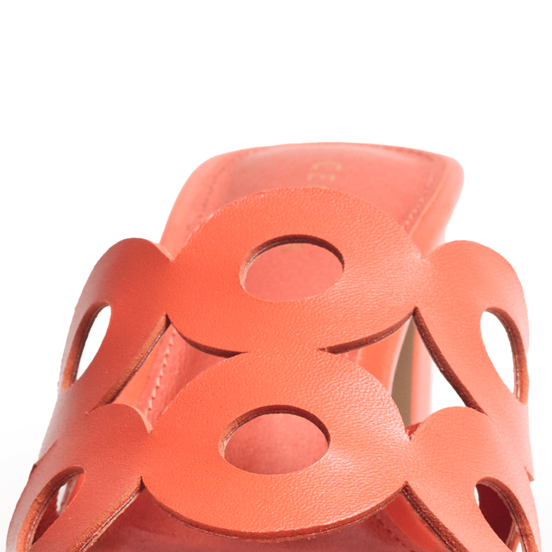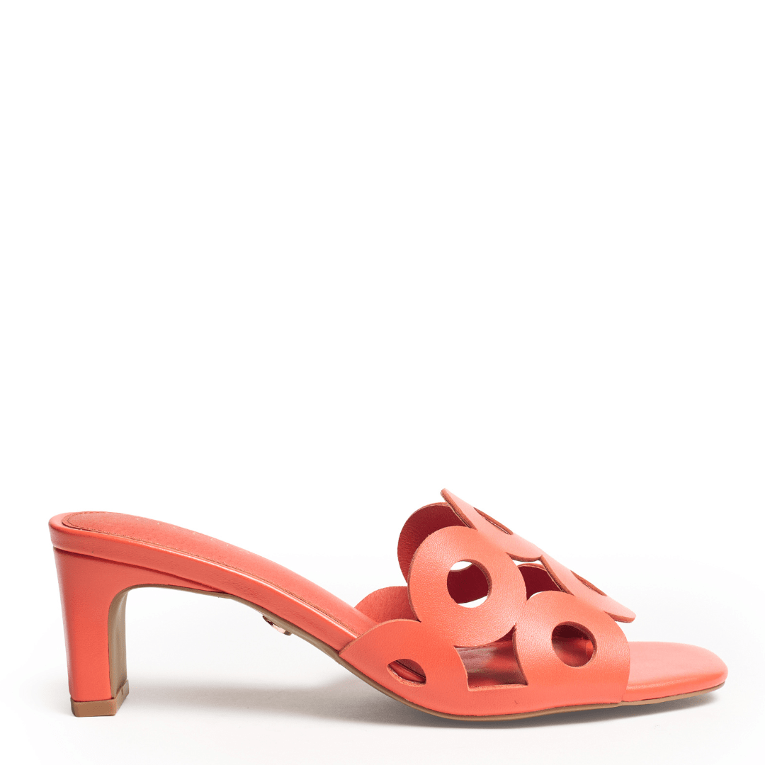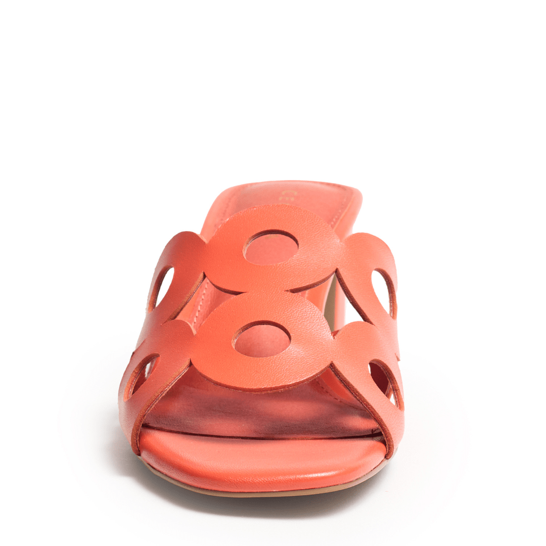 Meet Belmont, a modern statement slide designed to turn heads with effortless confidence. Sculptural circular cutouts create striking visual intrigue across the upper, giving this leather sandal a bold yet refined personality. Framed by a squared-off toe and balanced on a tapered mid-heel, Bellmont blends architectural design with feminine elegance.