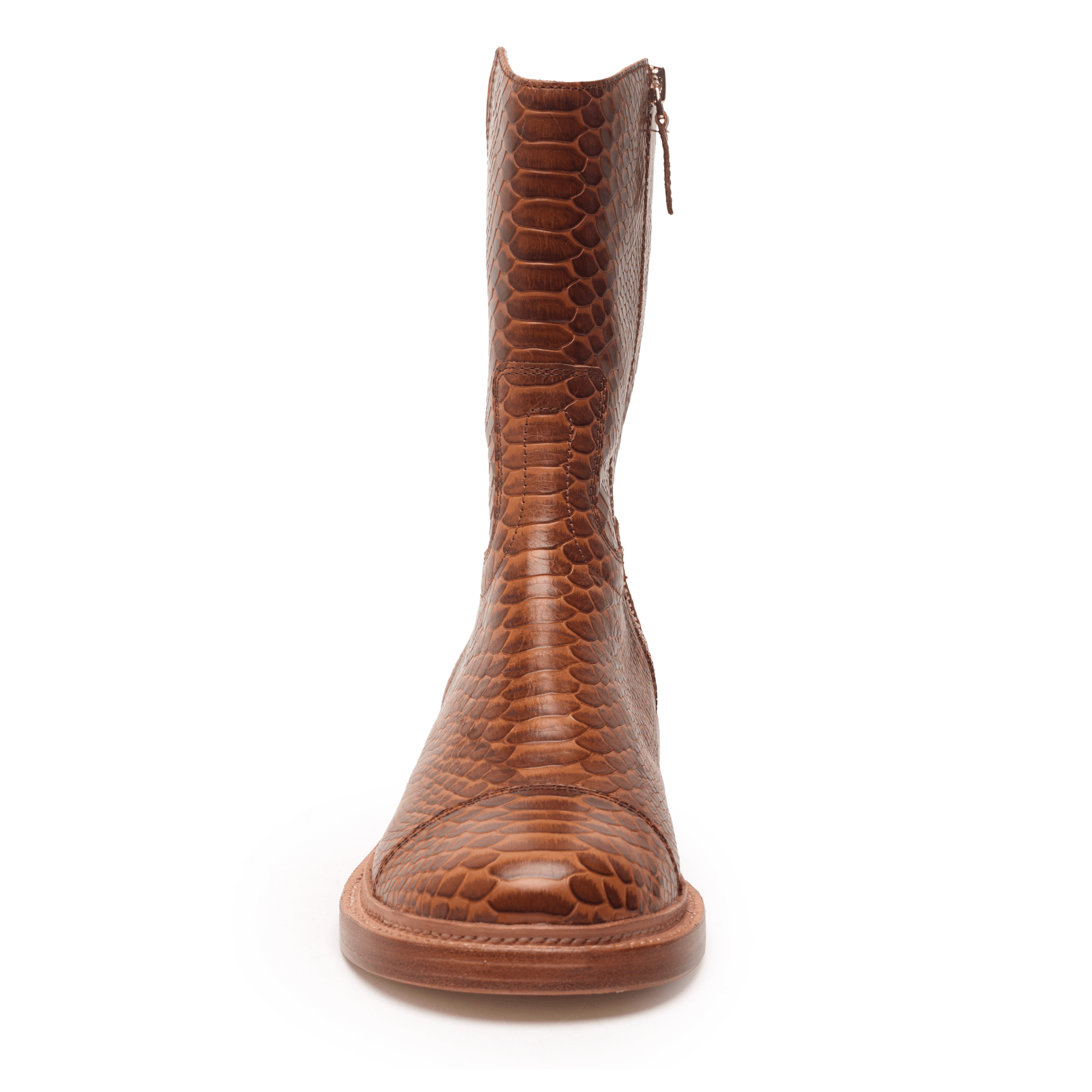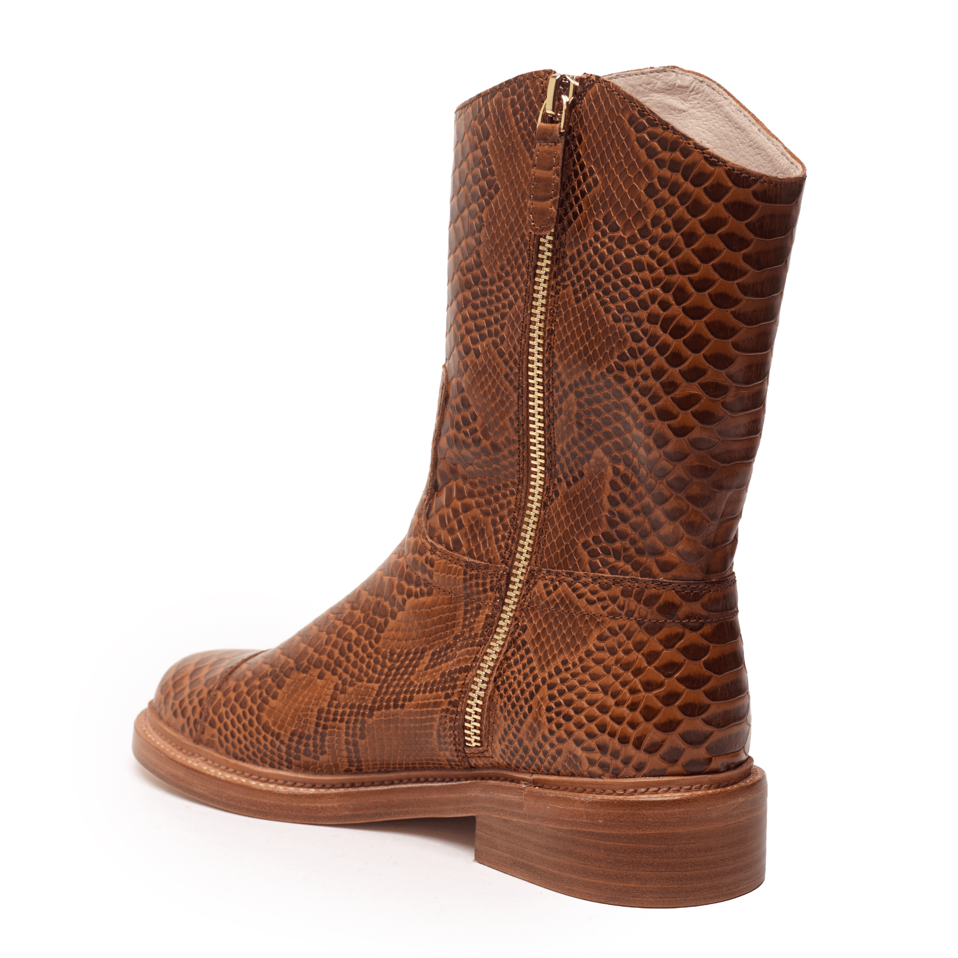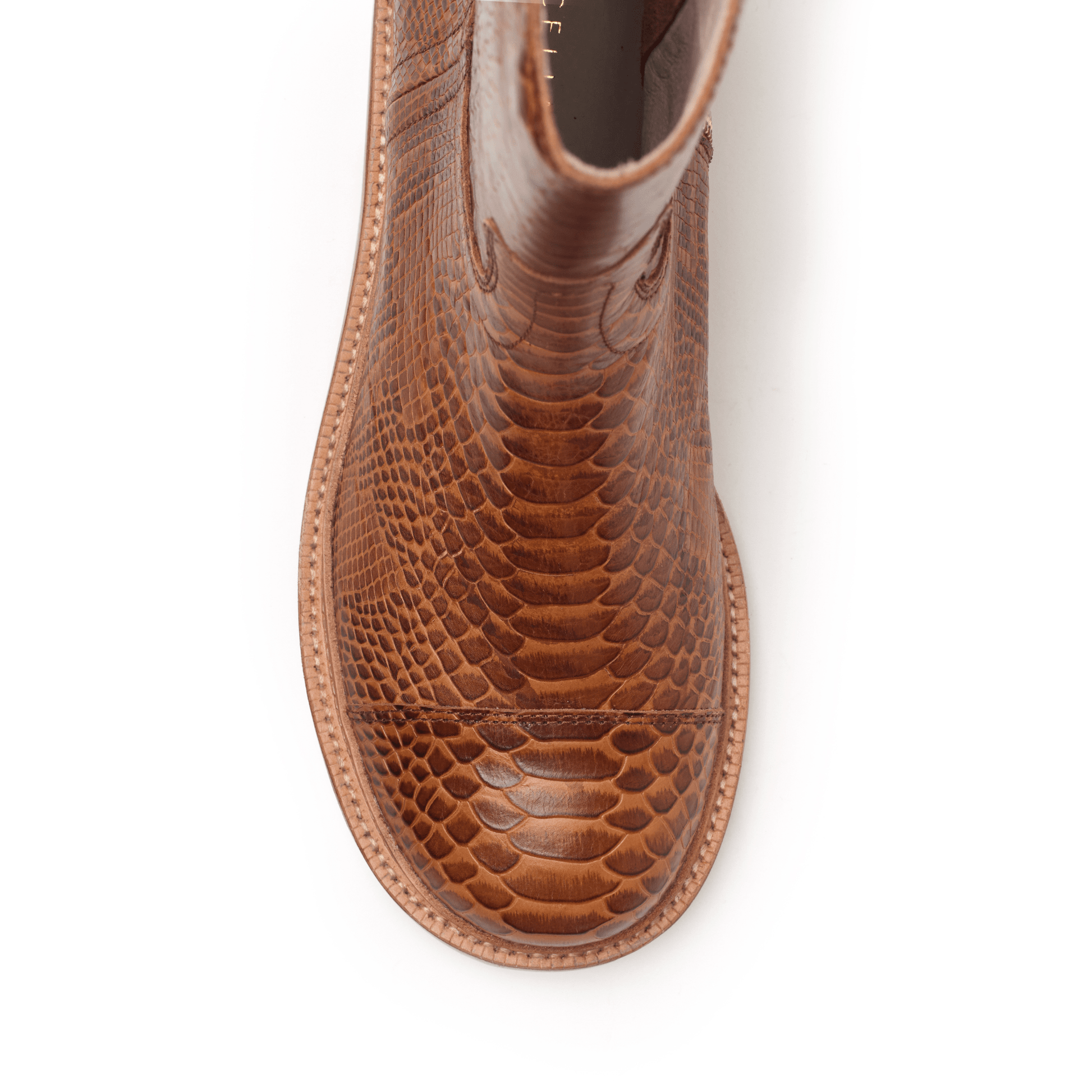 This handcrafted boot fashioned from snakeskin-embossed leather is shaped with a round toe and shorter shaft. It's crafted with 360º bench welt construction for durability and stability.