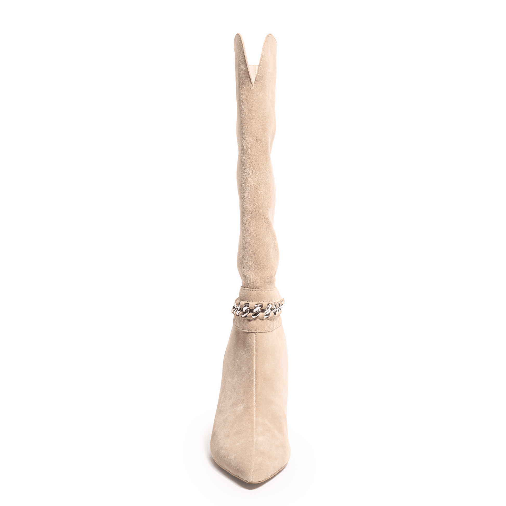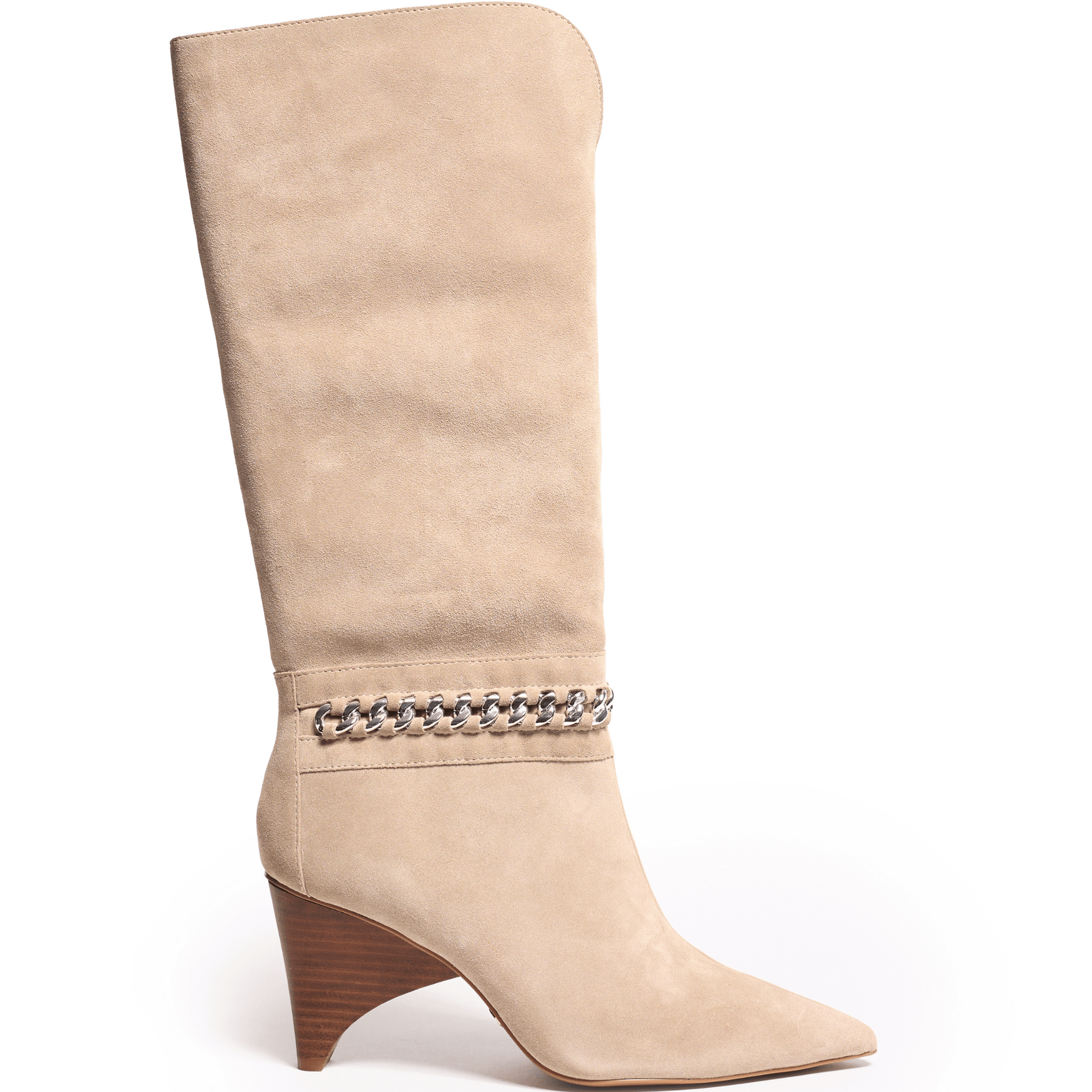 A suede shaft and sloped heel give this boot an architectural feel. A chain accent adds a flash of shine to balance the bold structure with a hint of glam.