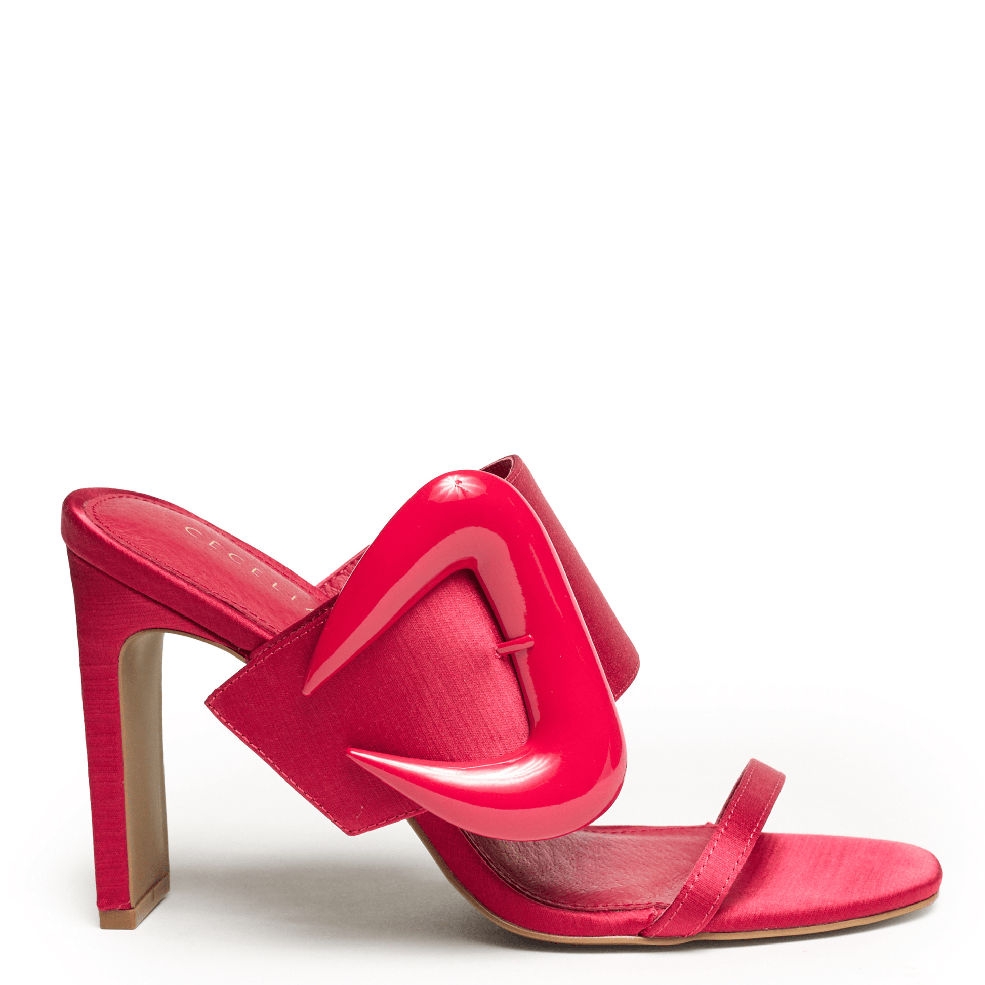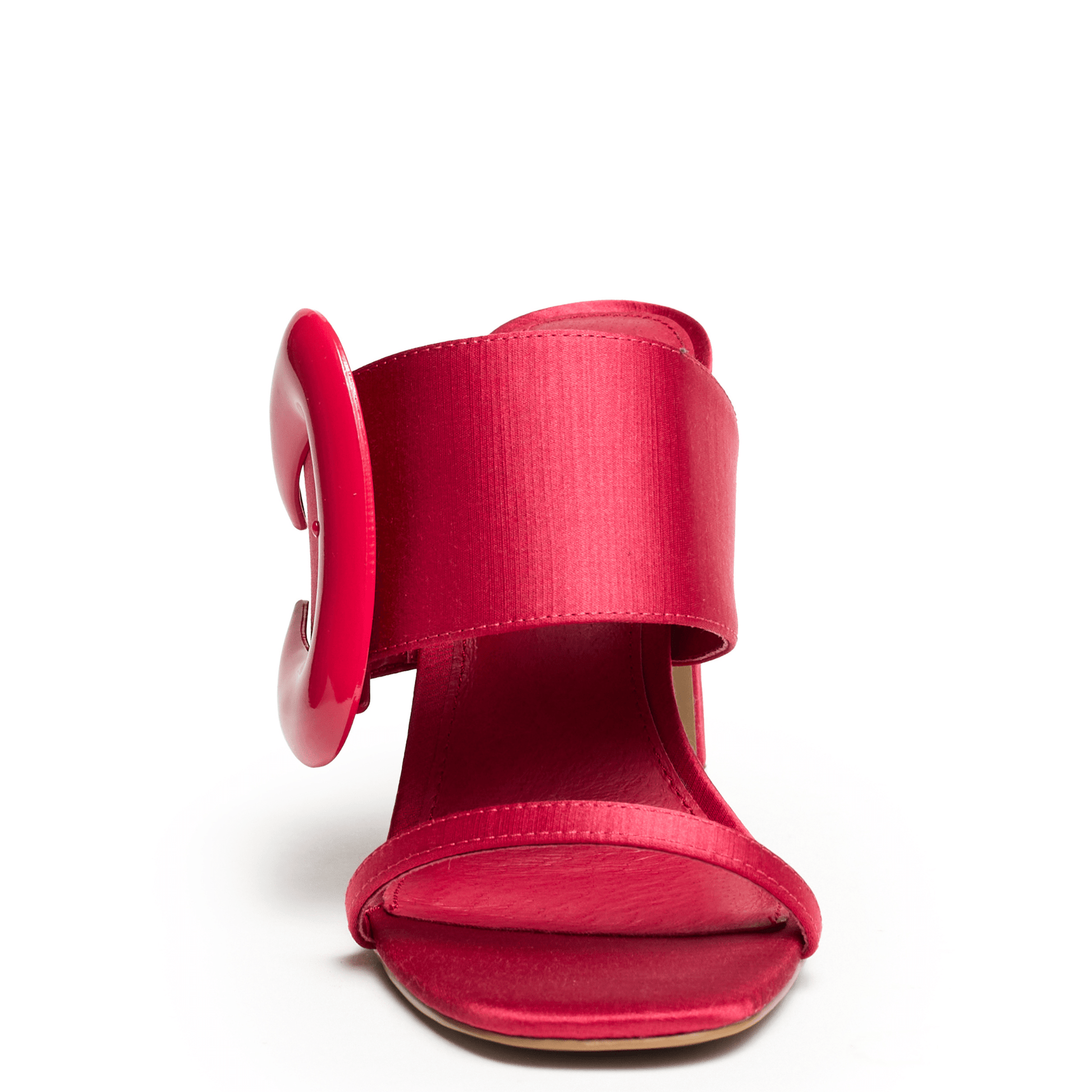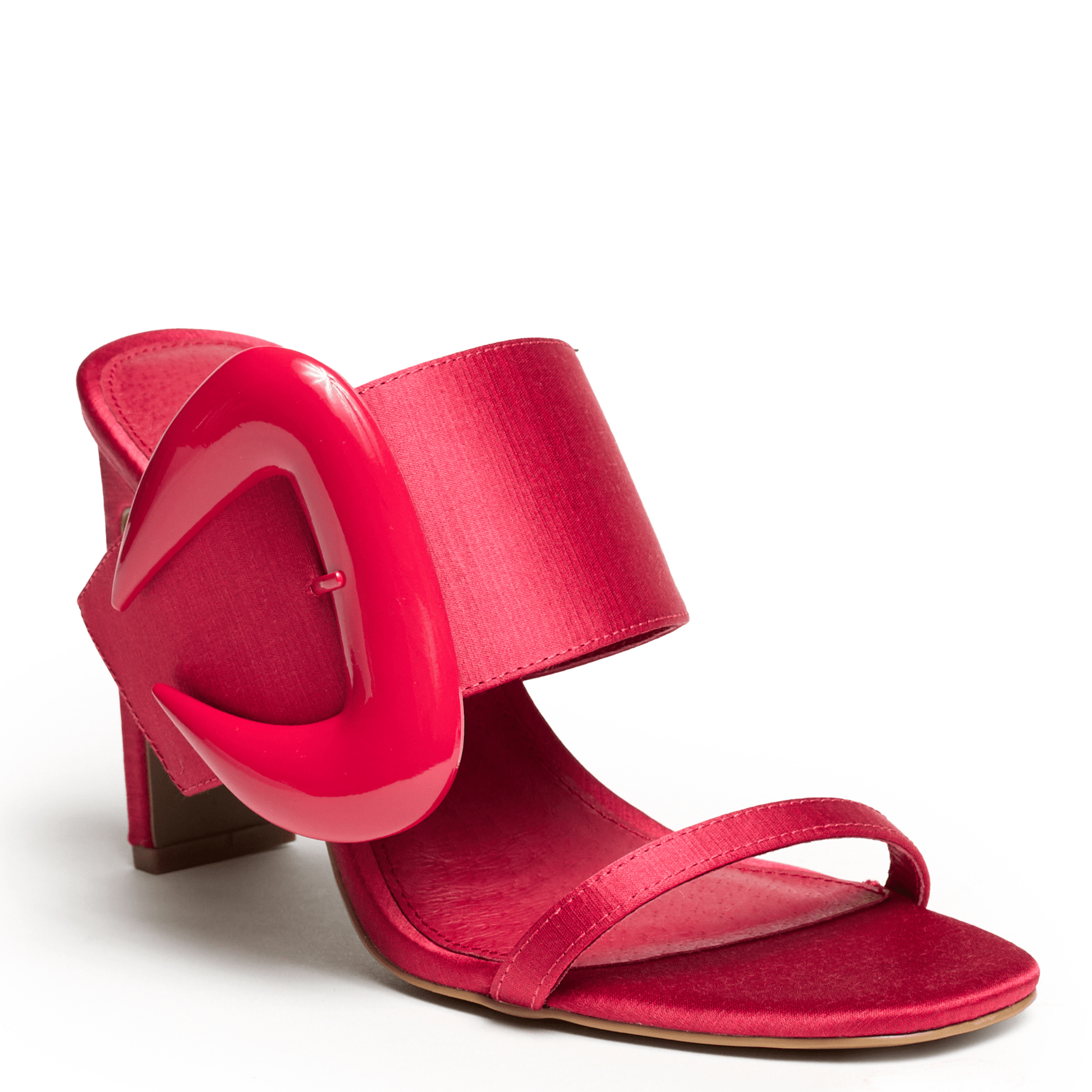 A large buckle defines the thick vamp strap atop this elegant satin sandal elevated by a tapered heel.