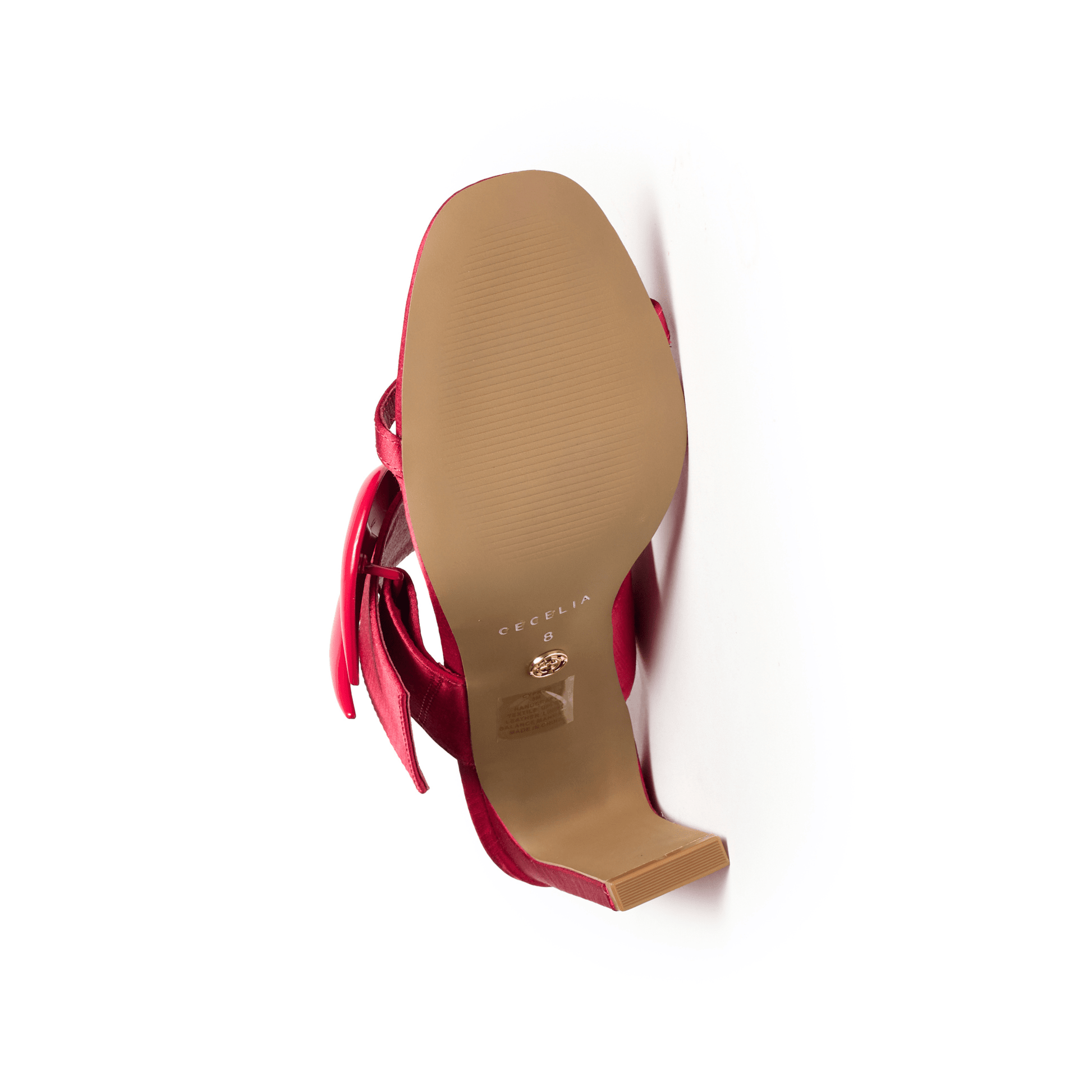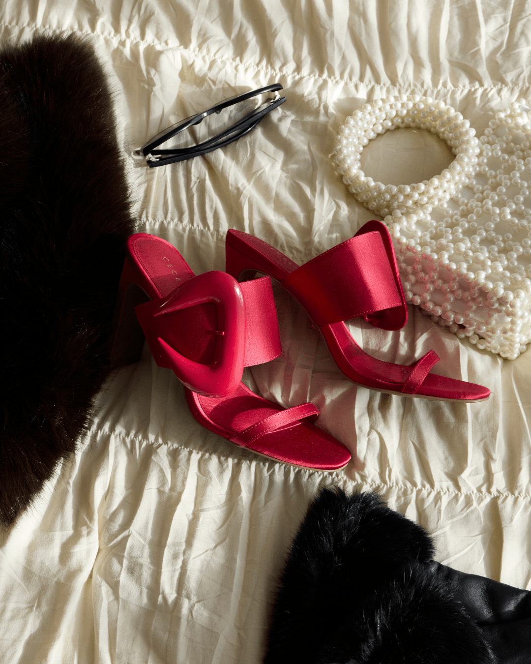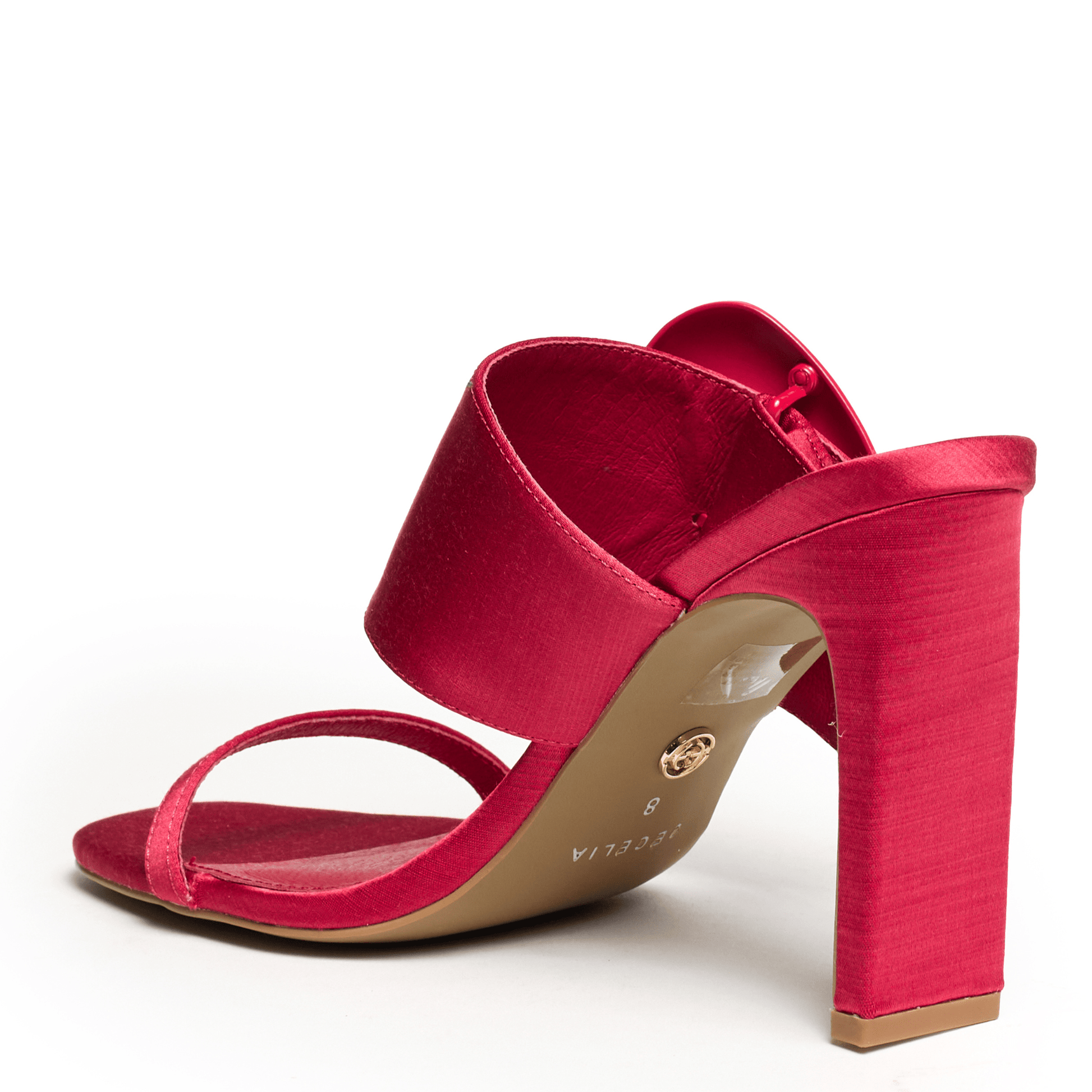 A large buckle defines the thick vamp strap atop this elegant satin sandal elevated by a tapered heel.