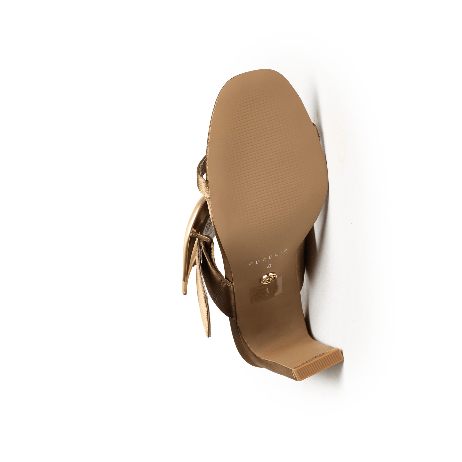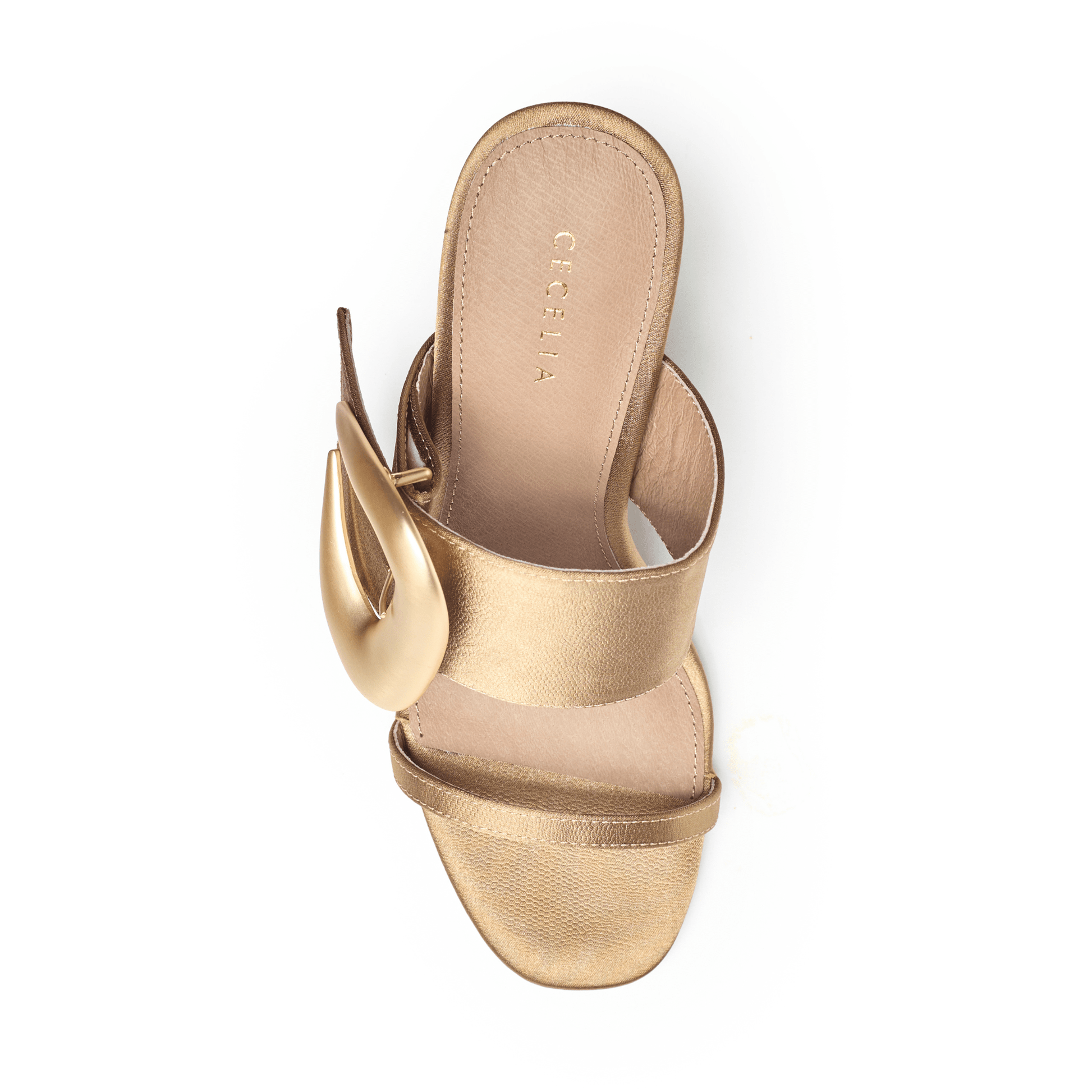 A large buckle defines the thick vamp strap atop this elegant satin sandal elevated by a tapered heel.