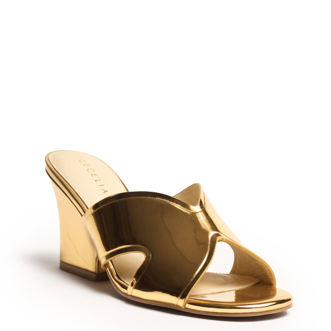 Clean lines and confident height define this modern wedge slide, designed for effortless sophistication. Wide crisscross leather straps create a sleek, minimalist silhouette that feels refined and versatile, making it an easy choice for elevated everyday dressing.