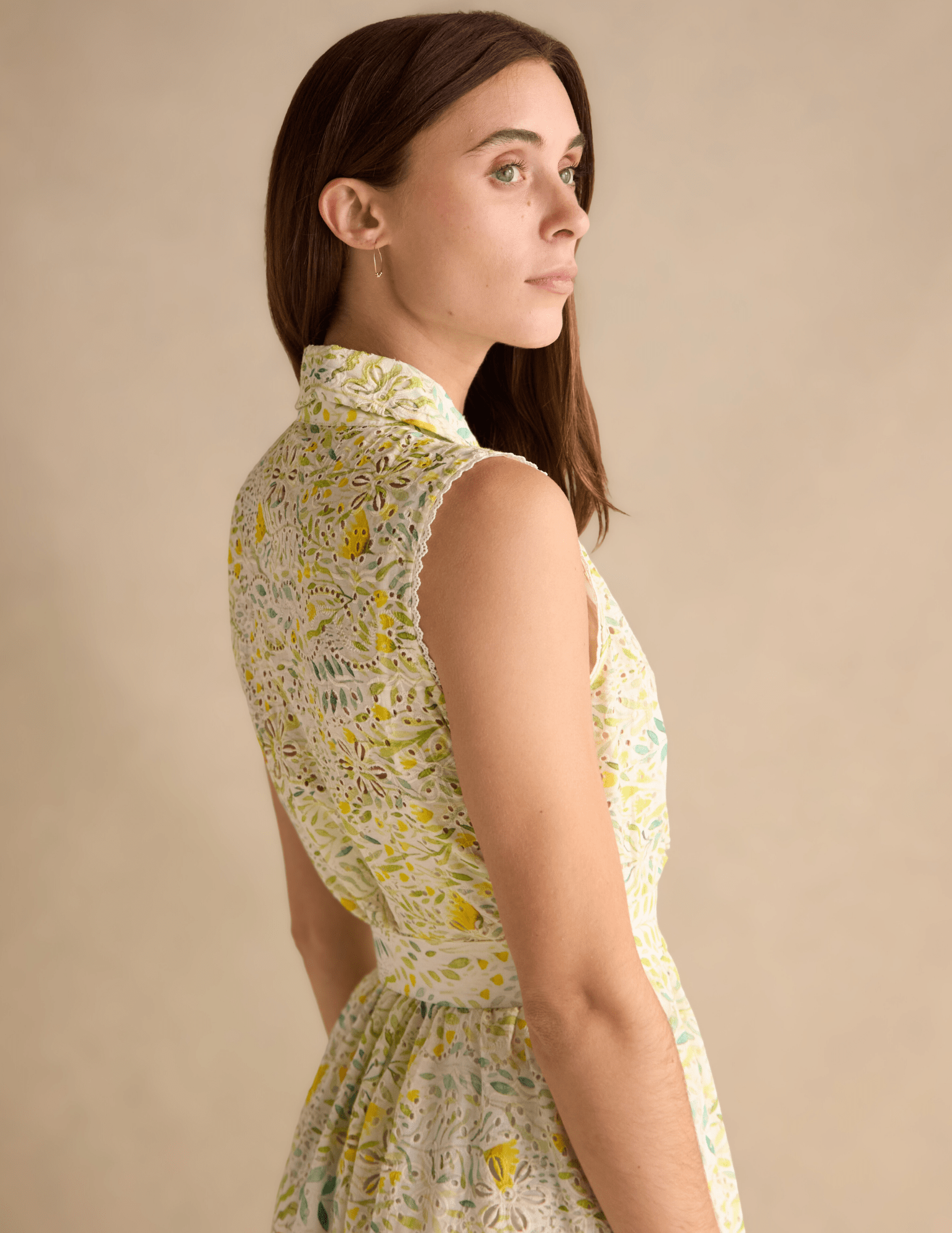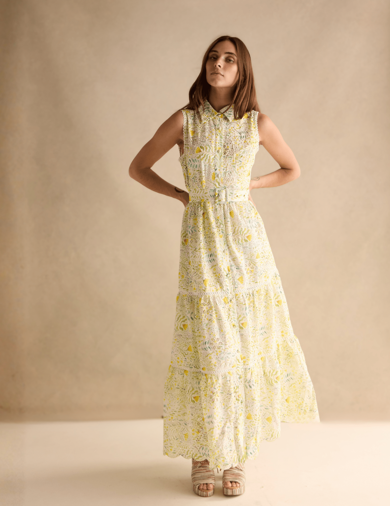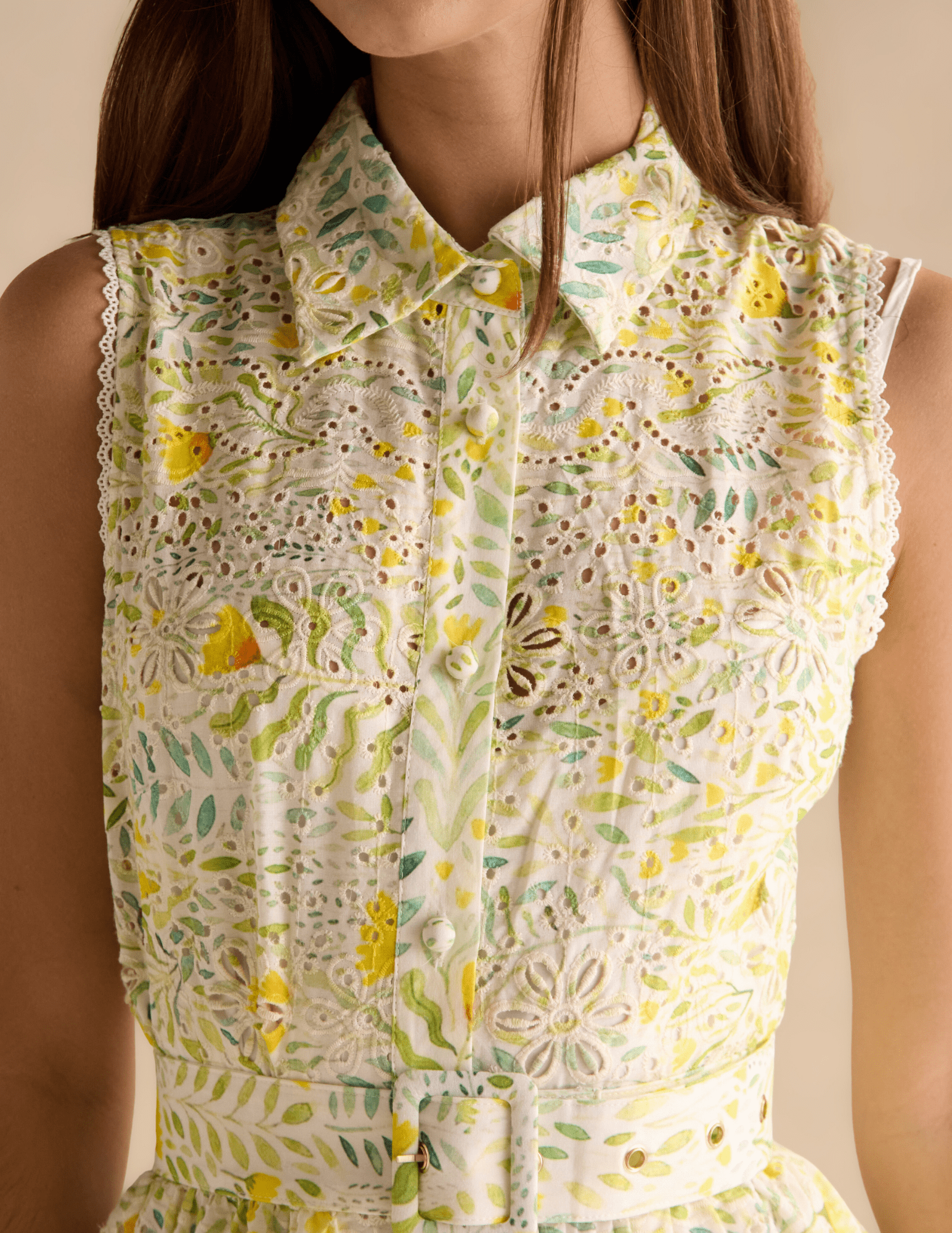 The Fraiser dress is a polished take on feminine ease. Crafted in an intricate eyelet fabrication with a soft, nature-inspired print, this sleeveless midi silhouette features a classic collar, button-front closure, and a coordinating belt that defines the waist with intention. Delicate lace edging and a tiered skirt add texture and movement, balancing structure with softness.