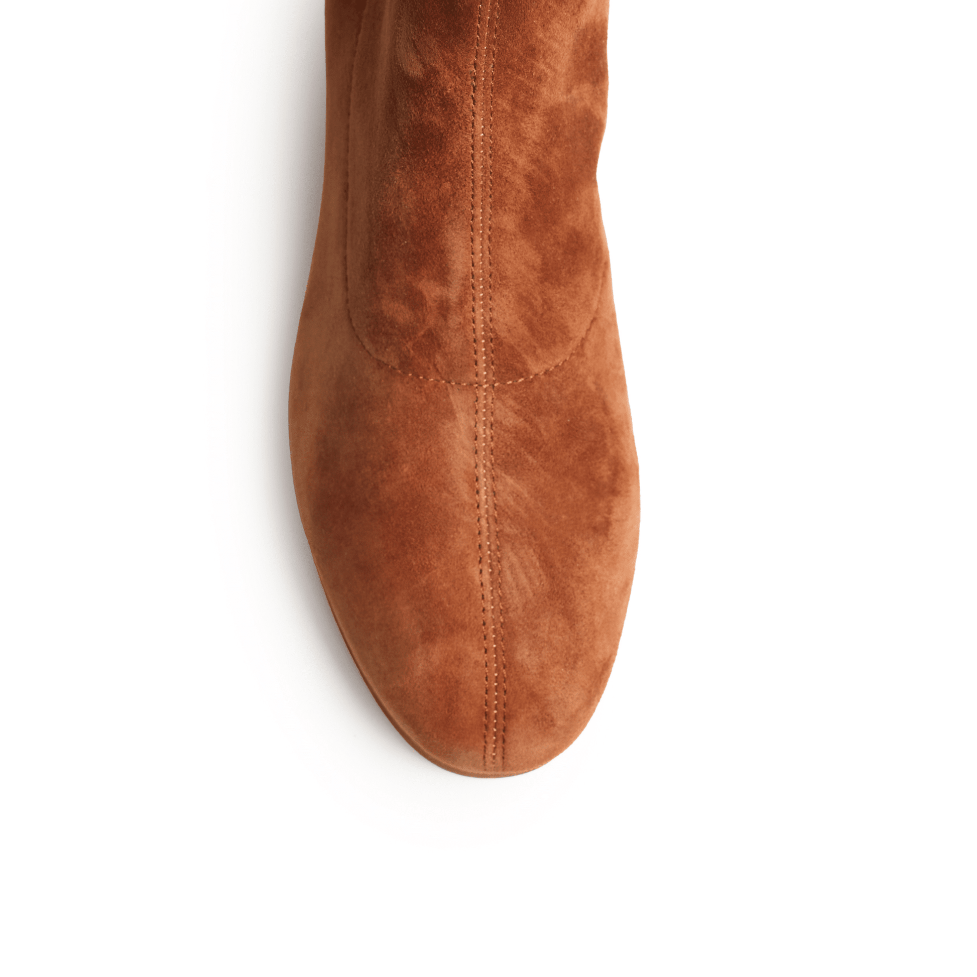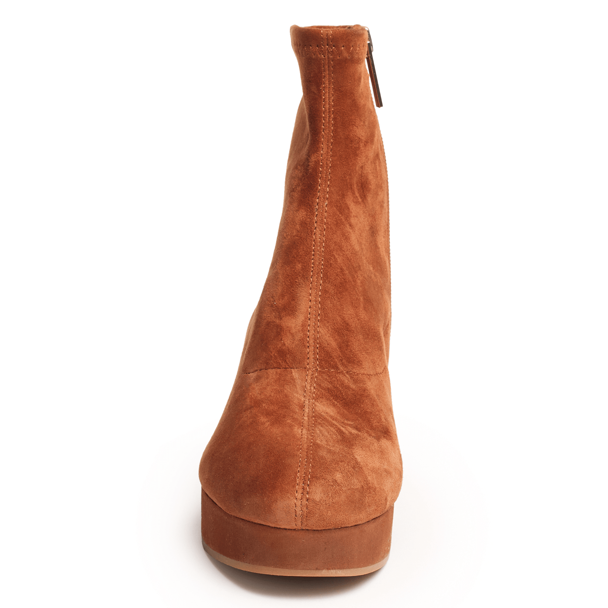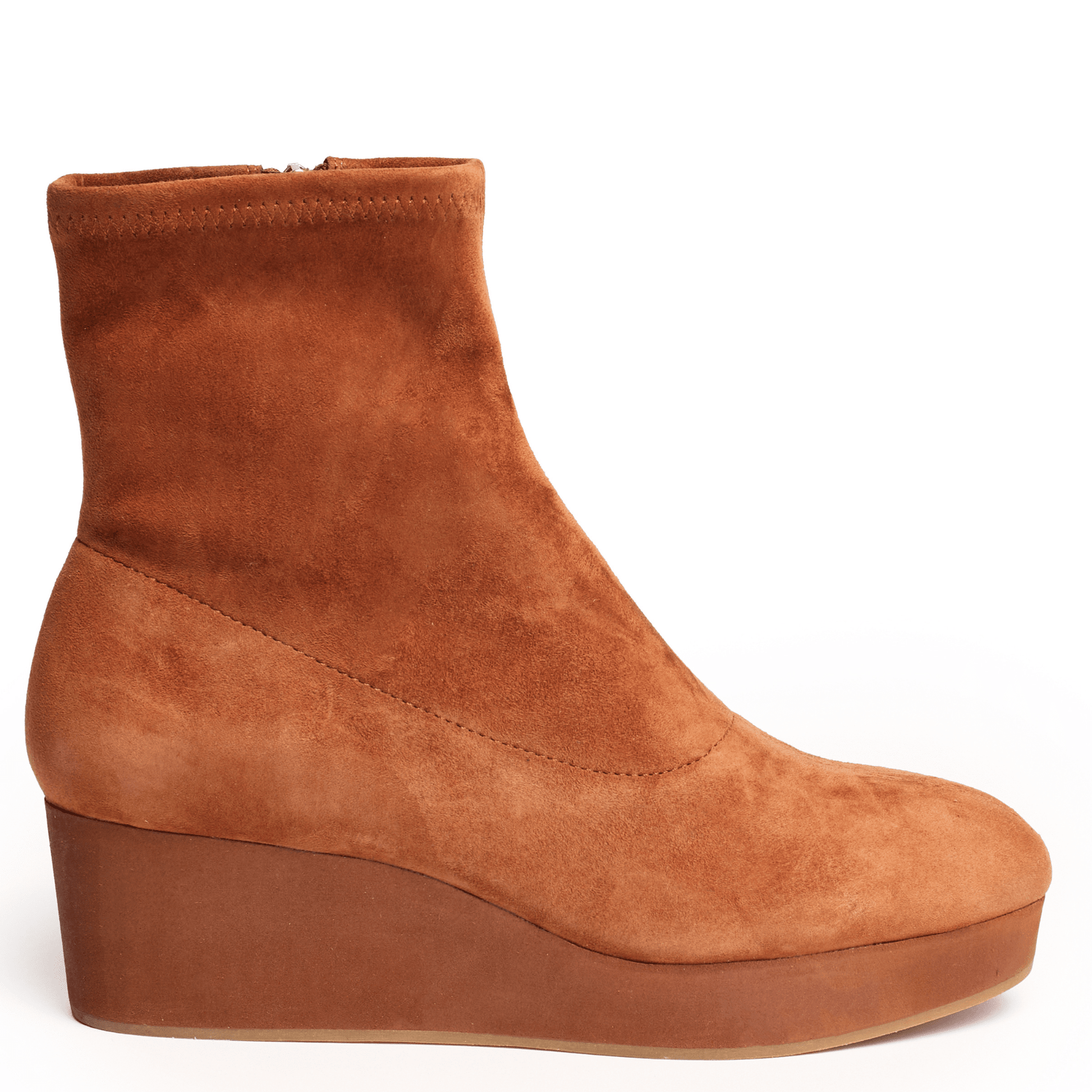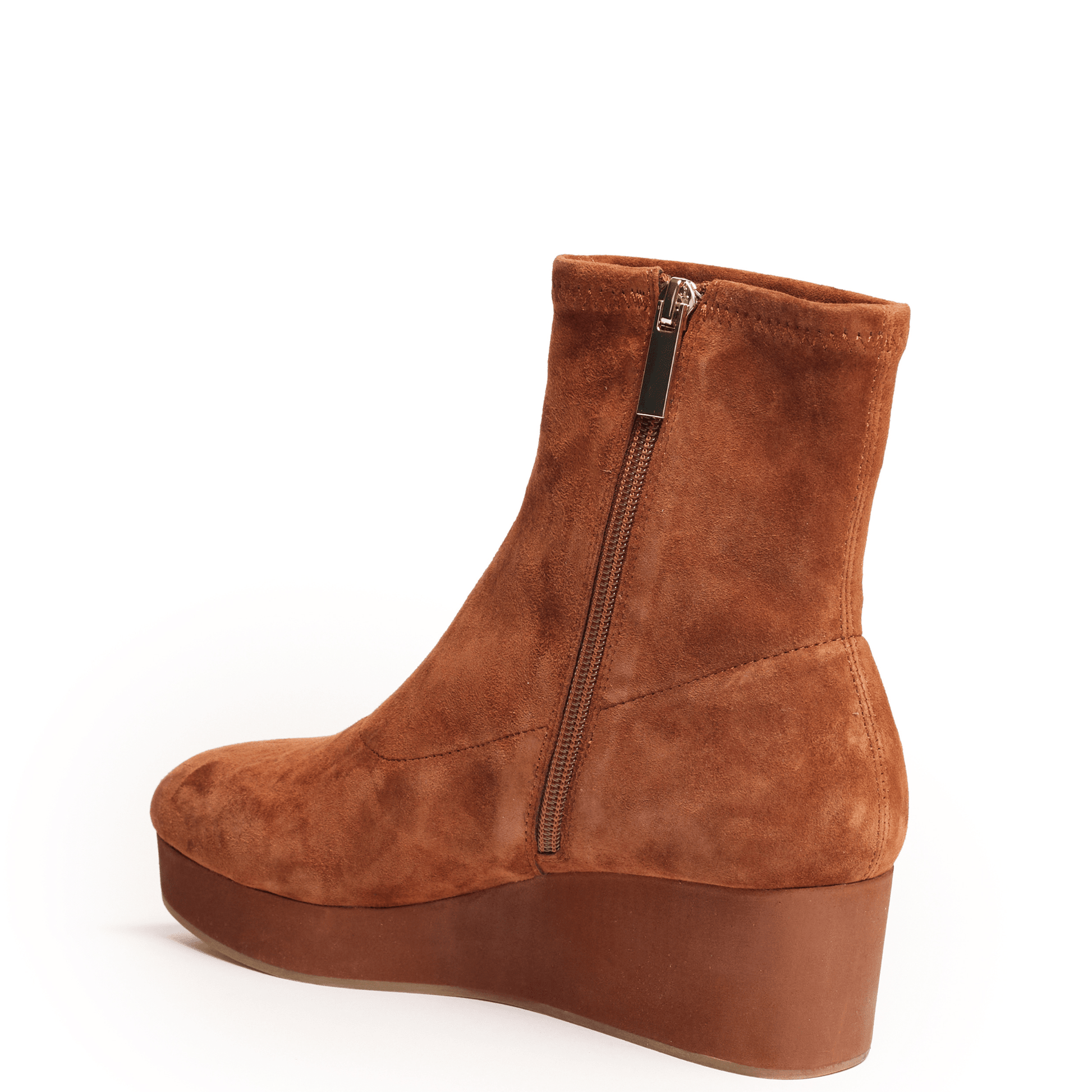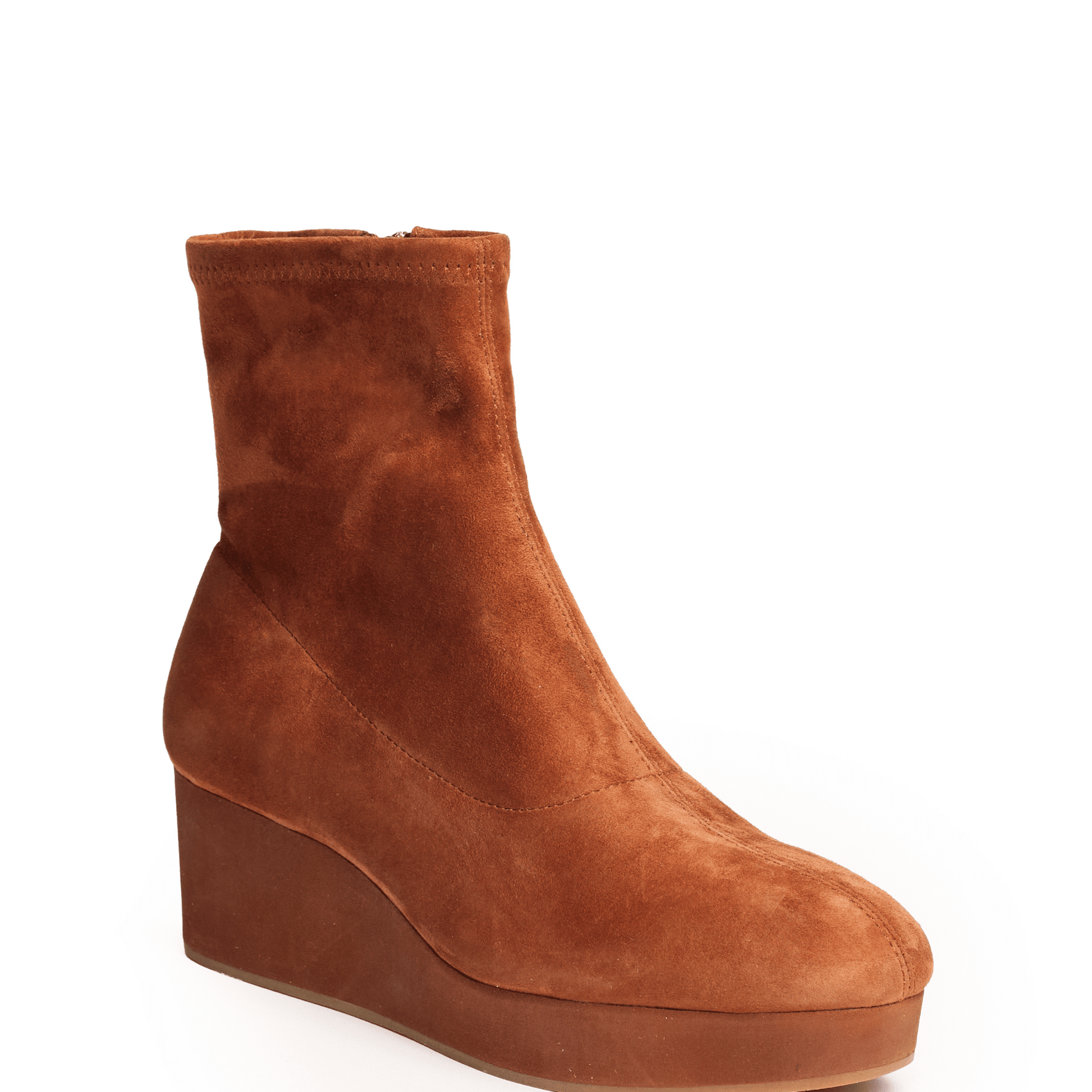 This sleek suede bootie features a fitted sock-like shaft and is set on a wedge heel that adds an extra flash of iconic glamour.