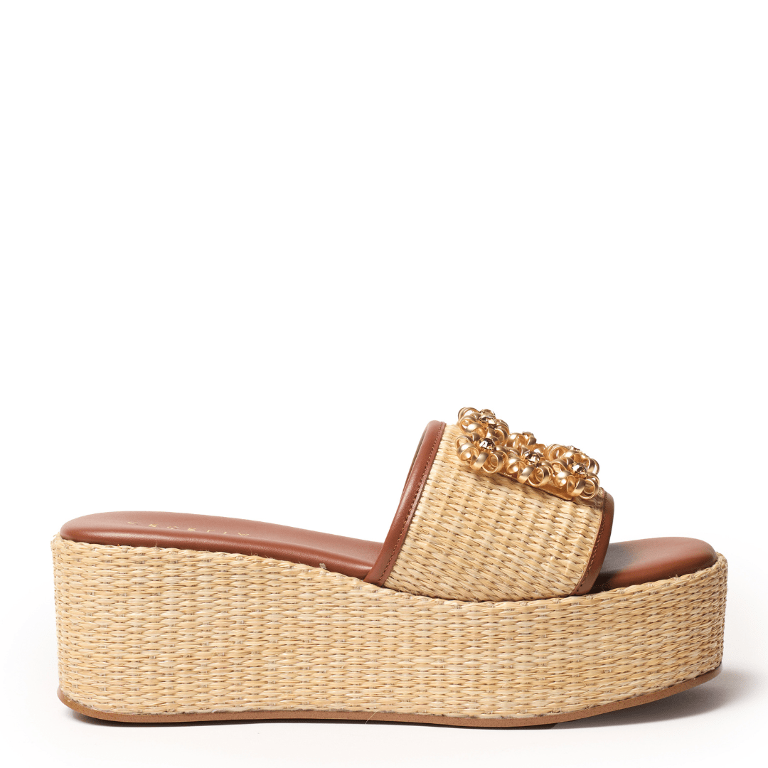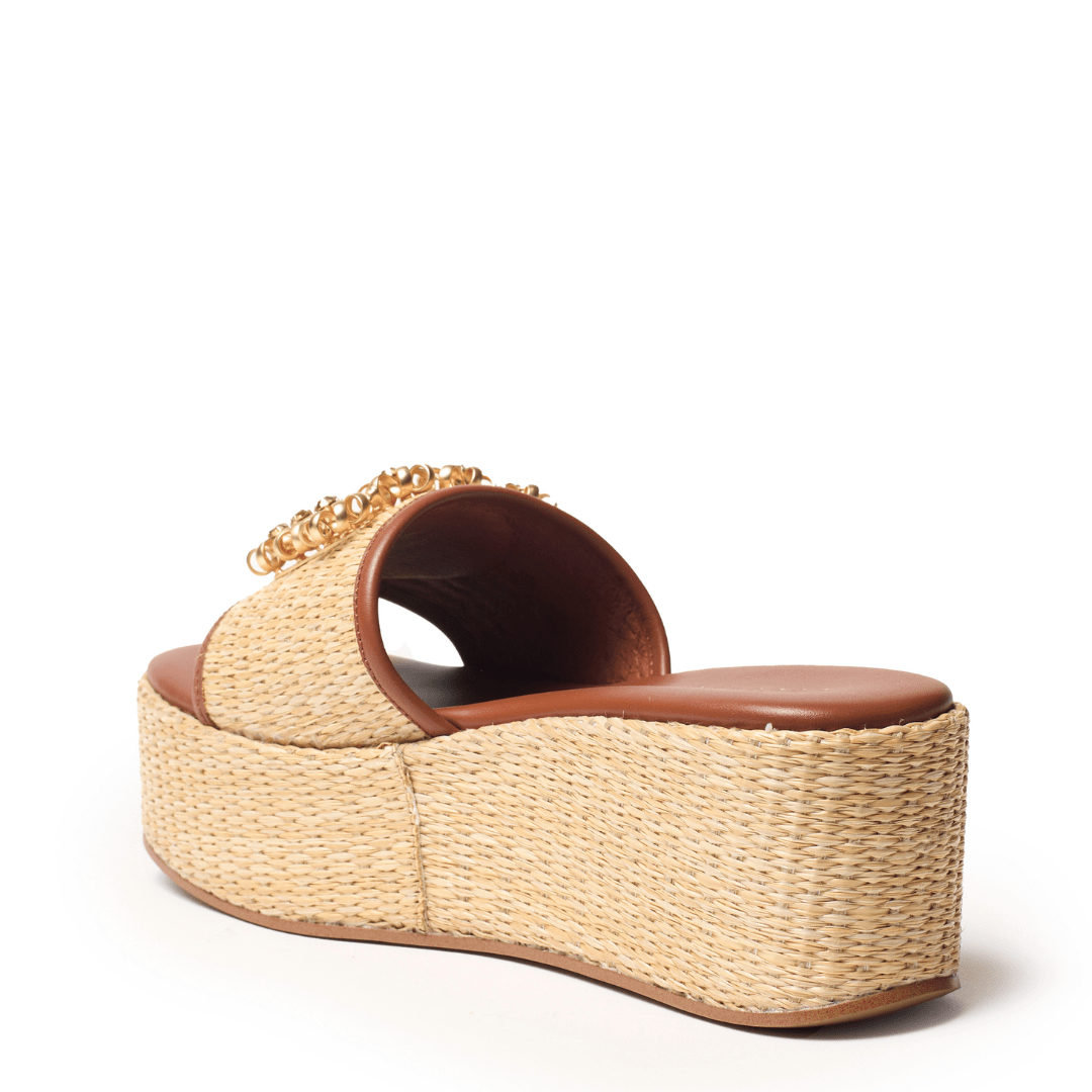 The raffia-wrapped platform delivers statement height while maintaining a balanced, easy-to-wear feel. Grounded by a cushioned footbed, this silhouette offers supportive comfort that makes it ideal for long days, travel itineraries, and relaxed summer occasions.