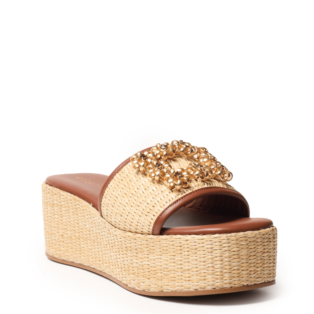 Effortless texture meets elevated design in this raffia-wrapped platform slide, created to bring natural sophistication to warm-weather dressing. A sculptural rosette buckle crowns the wide strap, adding a refined focal point that blends artisanal charm with polished elegance.