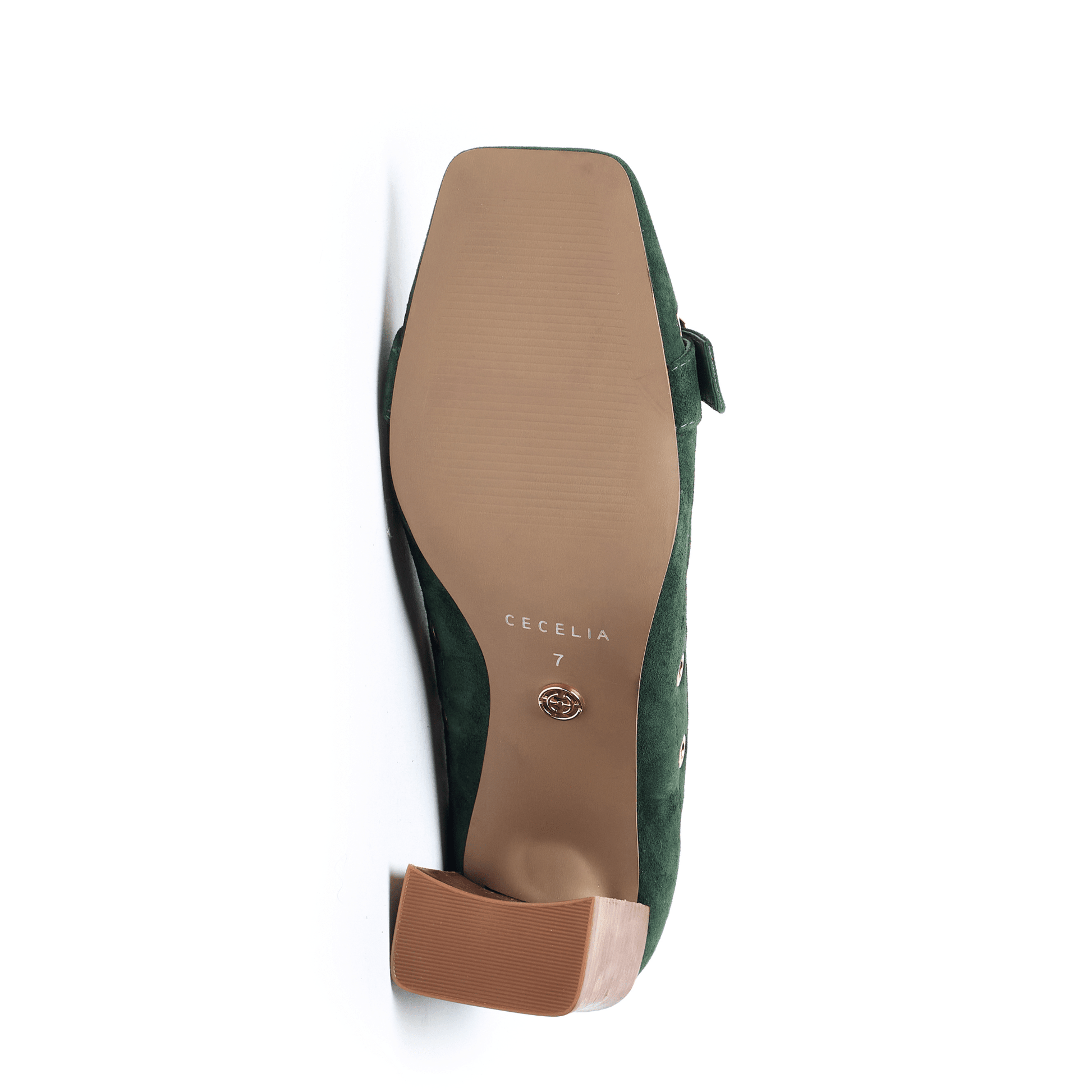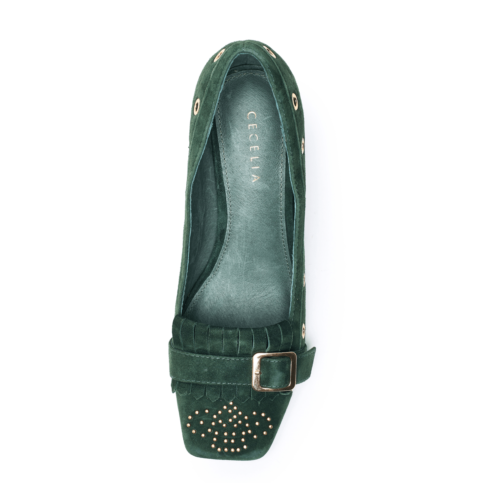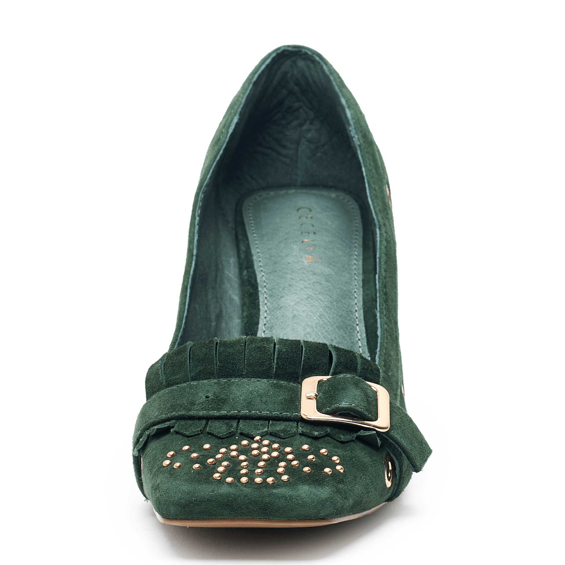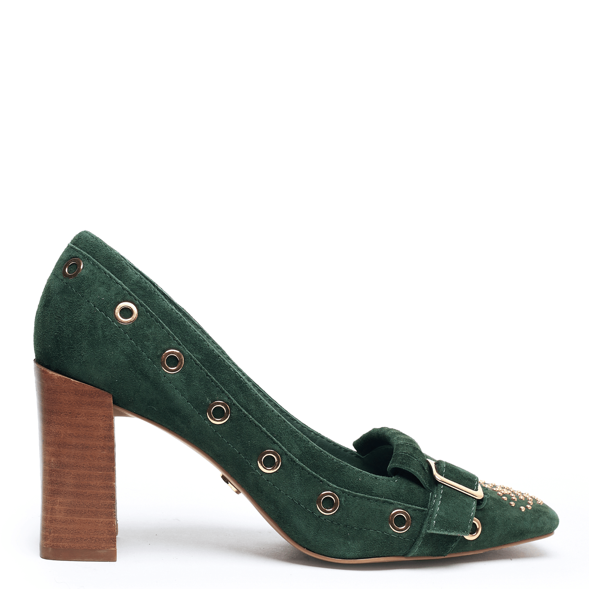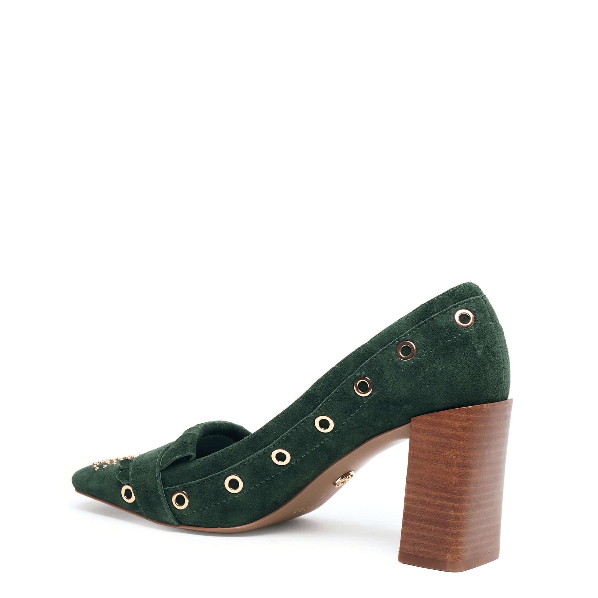 This suede loafer-inspired pump features a kiltie vamp accentuated with polished grommets. It rests on a comfortable cushioned footbed and a stacked block heel.