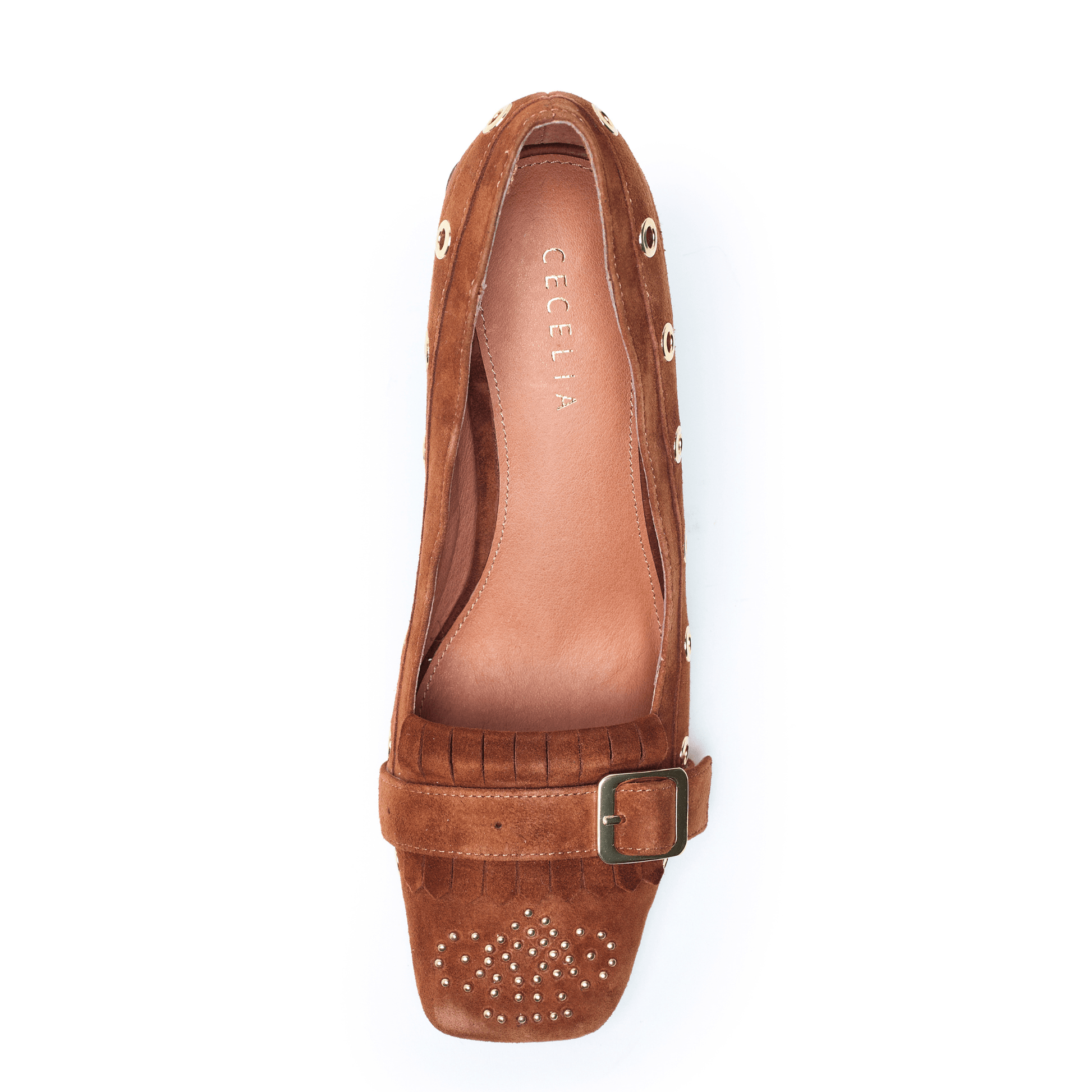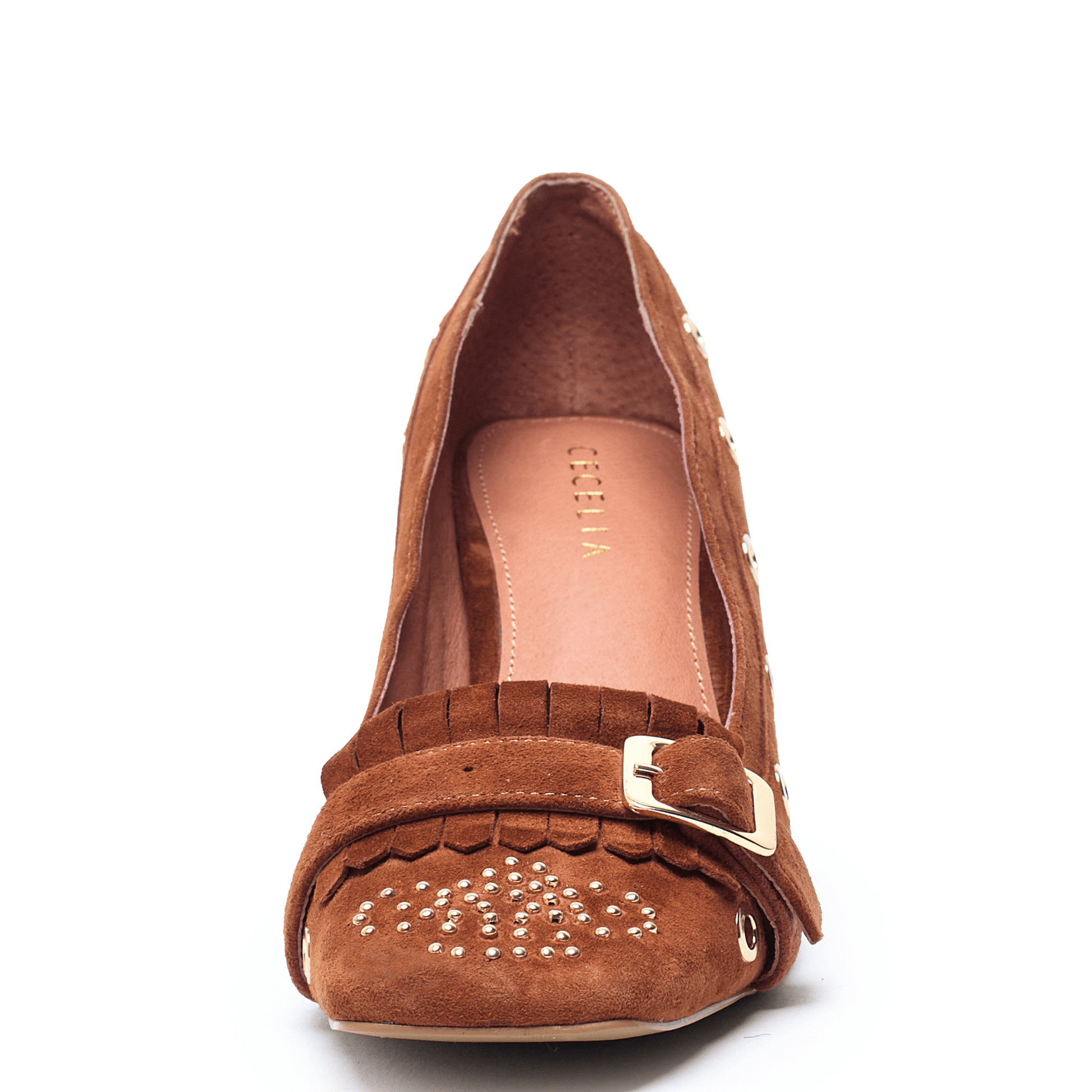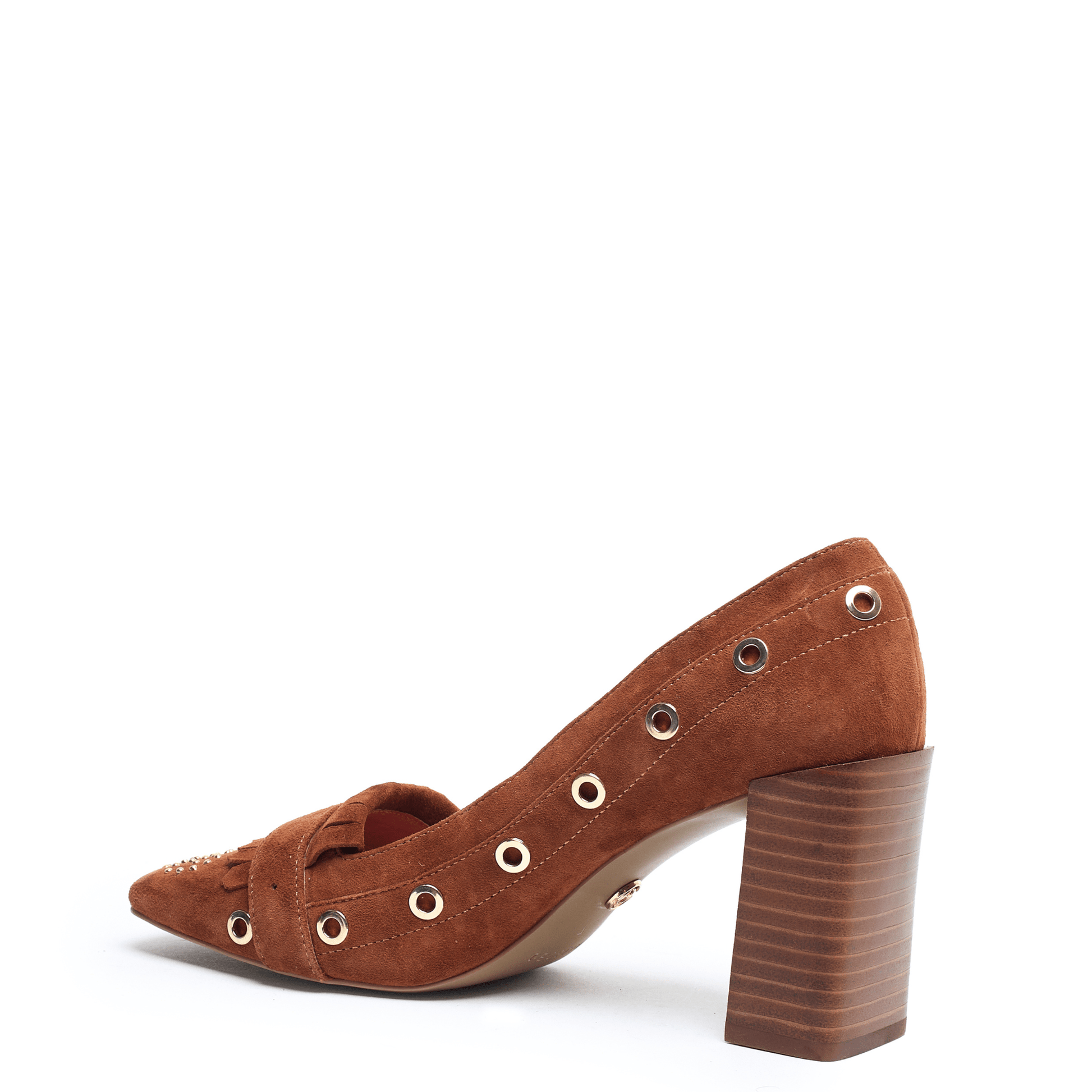 This suede loafer-inspired pump features a kiltie vamp accentuated with polished grommets. It rests on a comfortable cushioned footbed and a stacked block heel.