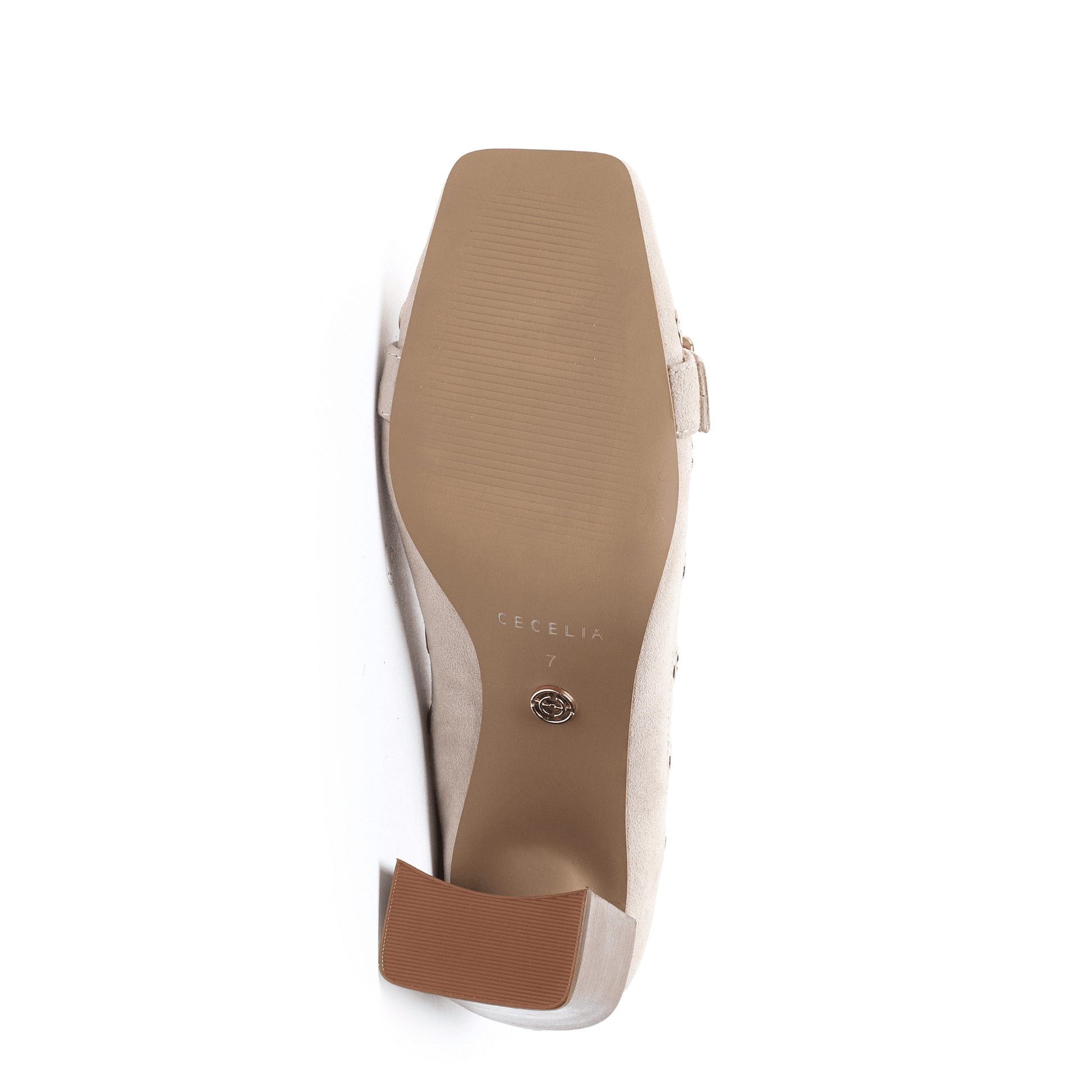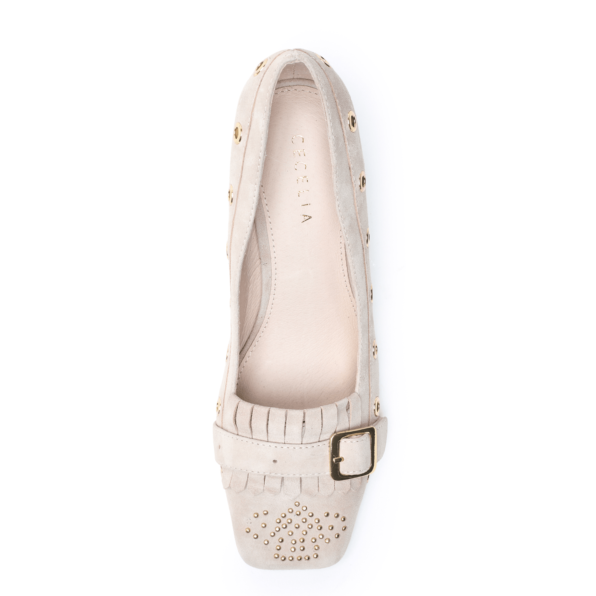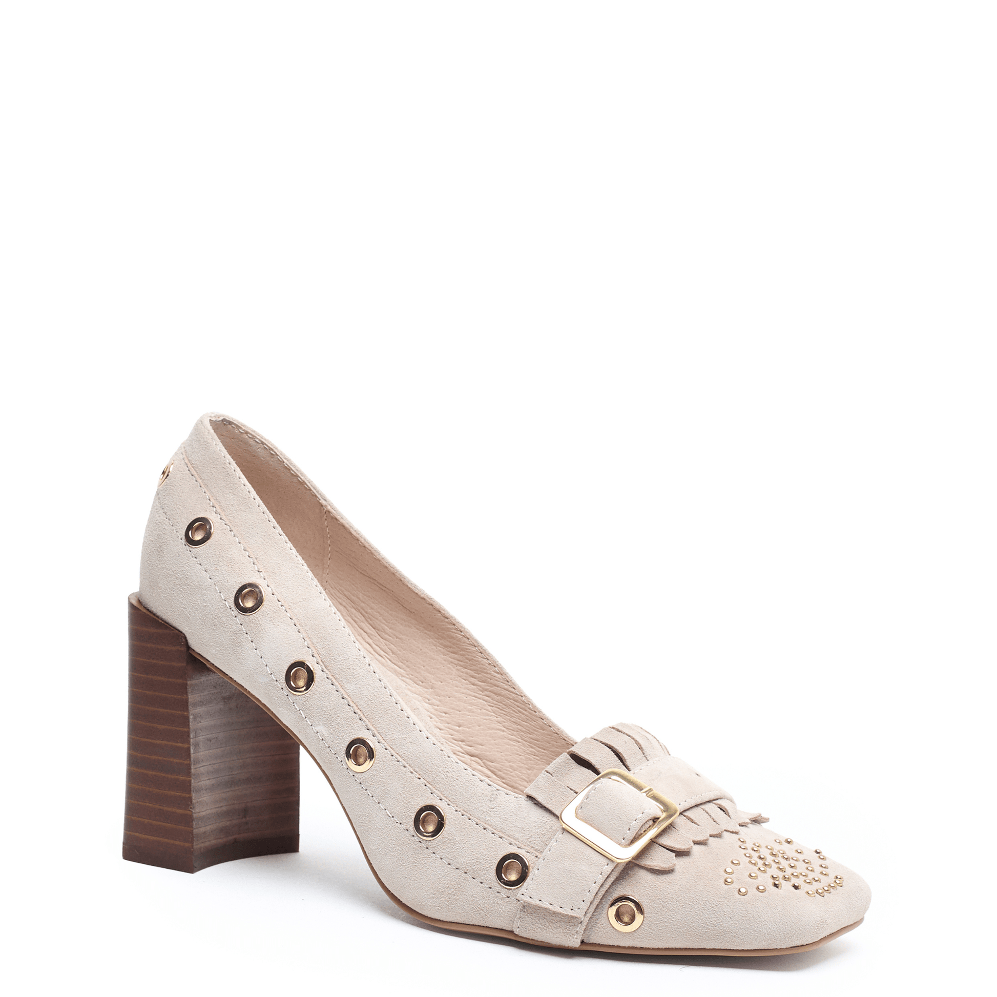 This suede loafer-inspired pump features a kiltie vamp accentuated with polished grommets. It rests on a comfortable cushioned footbed and a stacked block heel.
