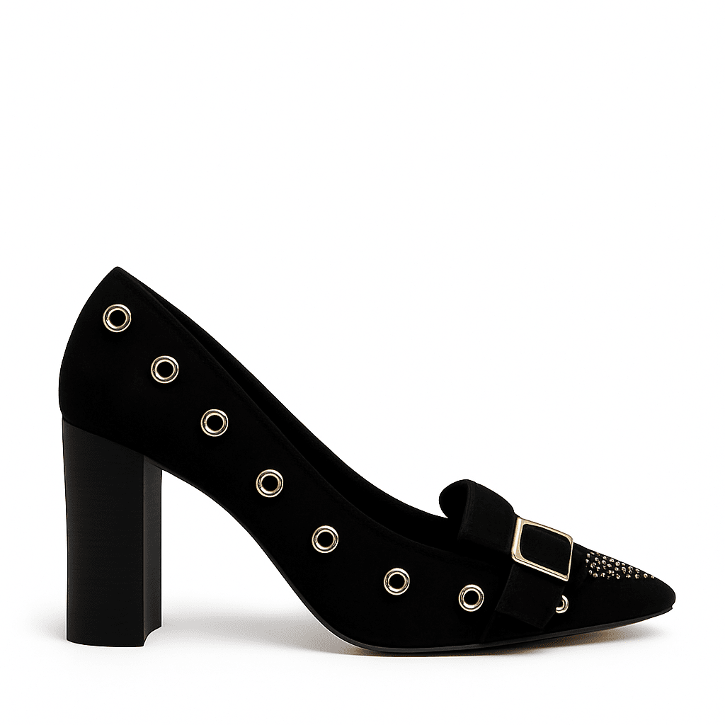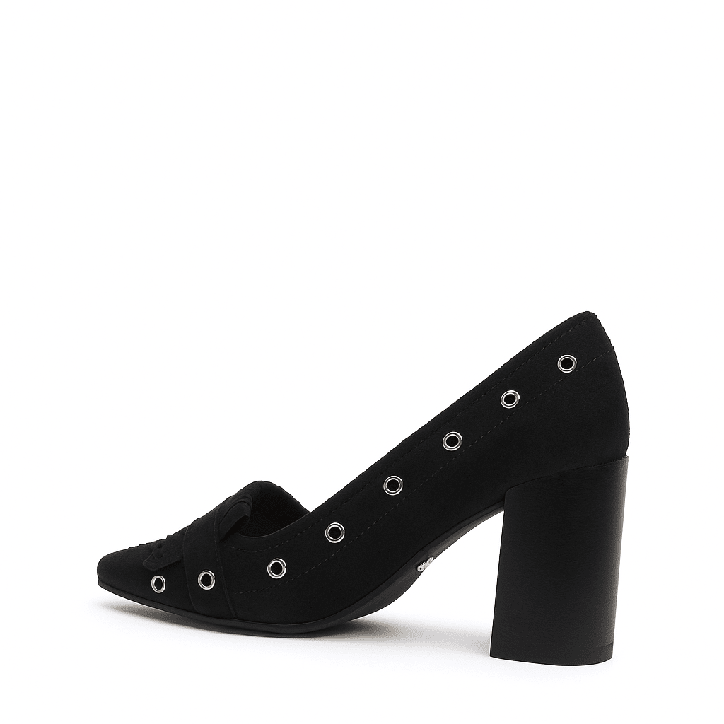 This suede loafer-inspired pump features a kiltie vamp accentuated with polished grommets. It rests on a comfortable cushioned footbed and a stacked block heel.