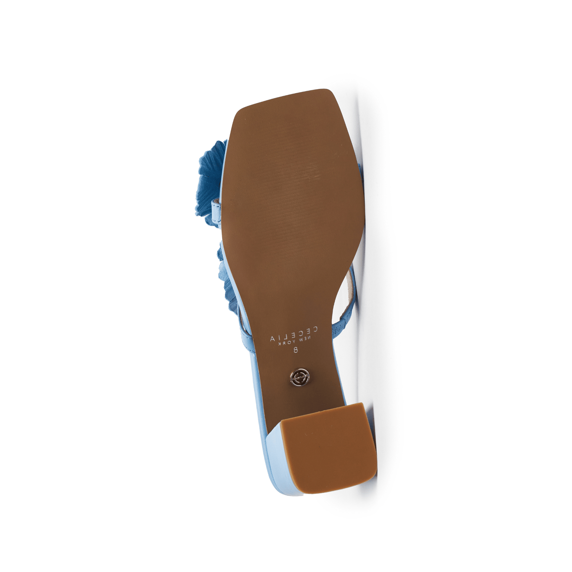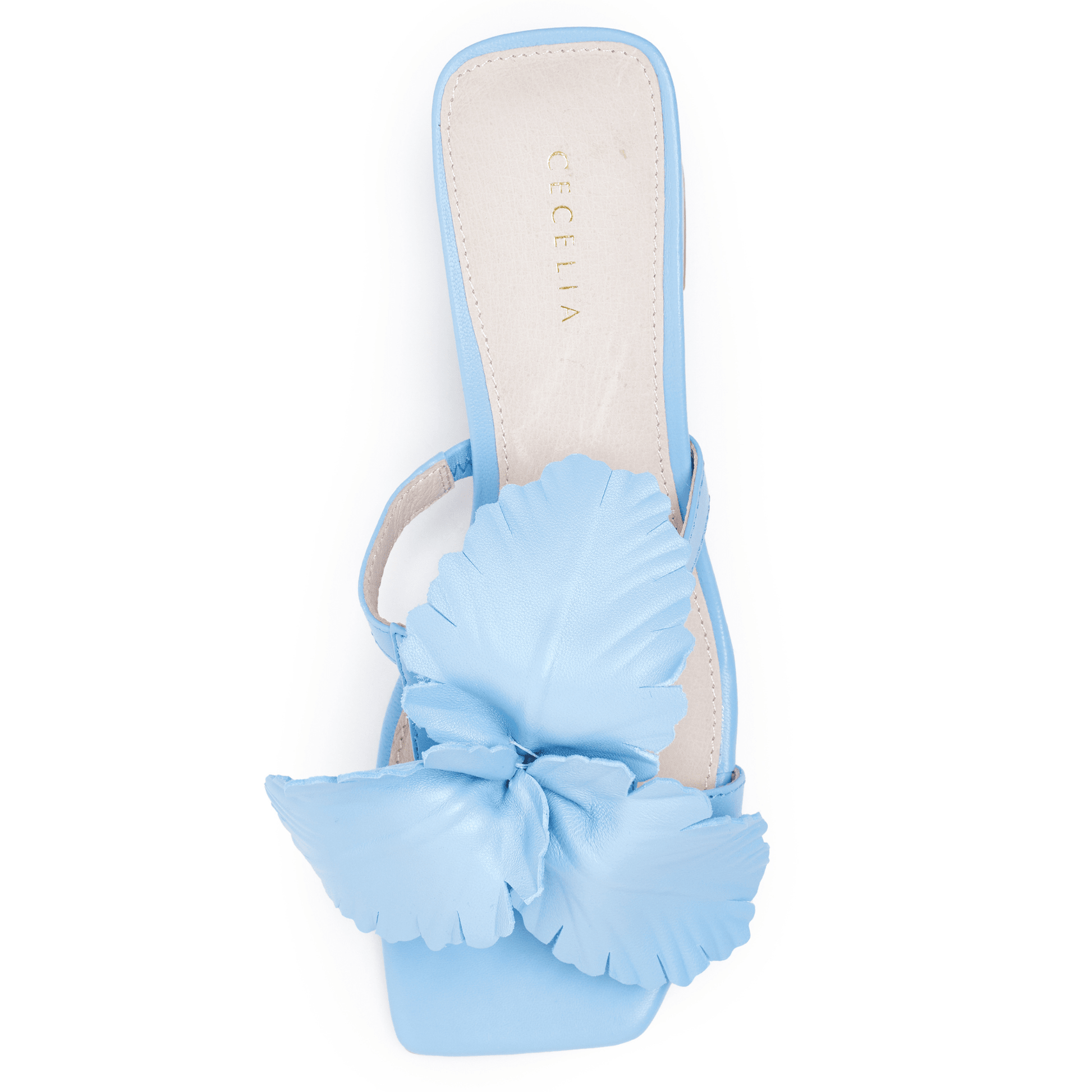 A bold flower blooms in the center of this beautiful block heel mule sandal