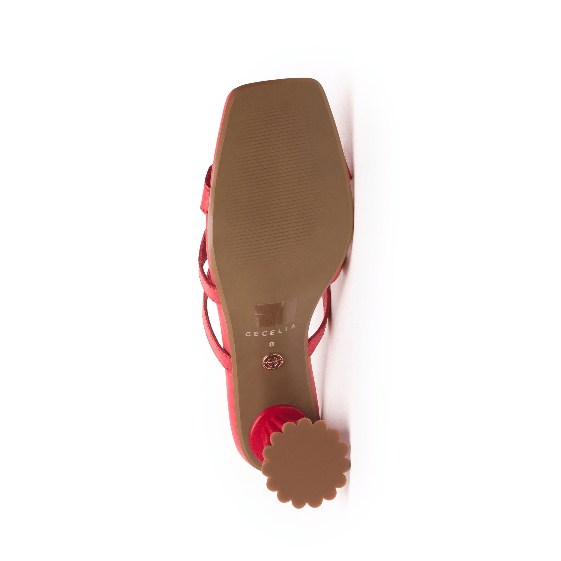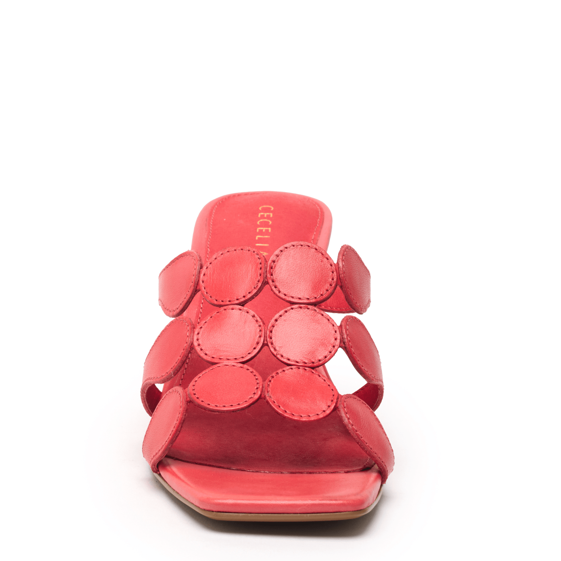 The Jessica is a bold leather slide featuring circular cutout straps, a square toe, and a sculptural flared heel.