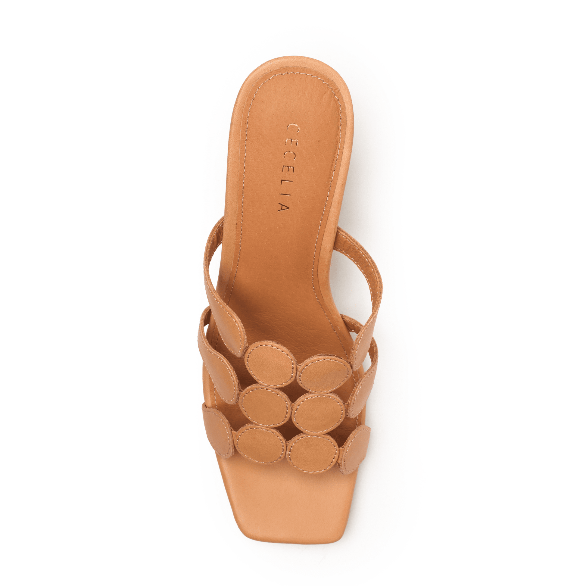 The Jessica is a bold leather slide featuring circular cutout straps, a square toe, and a sculptural flared heel.