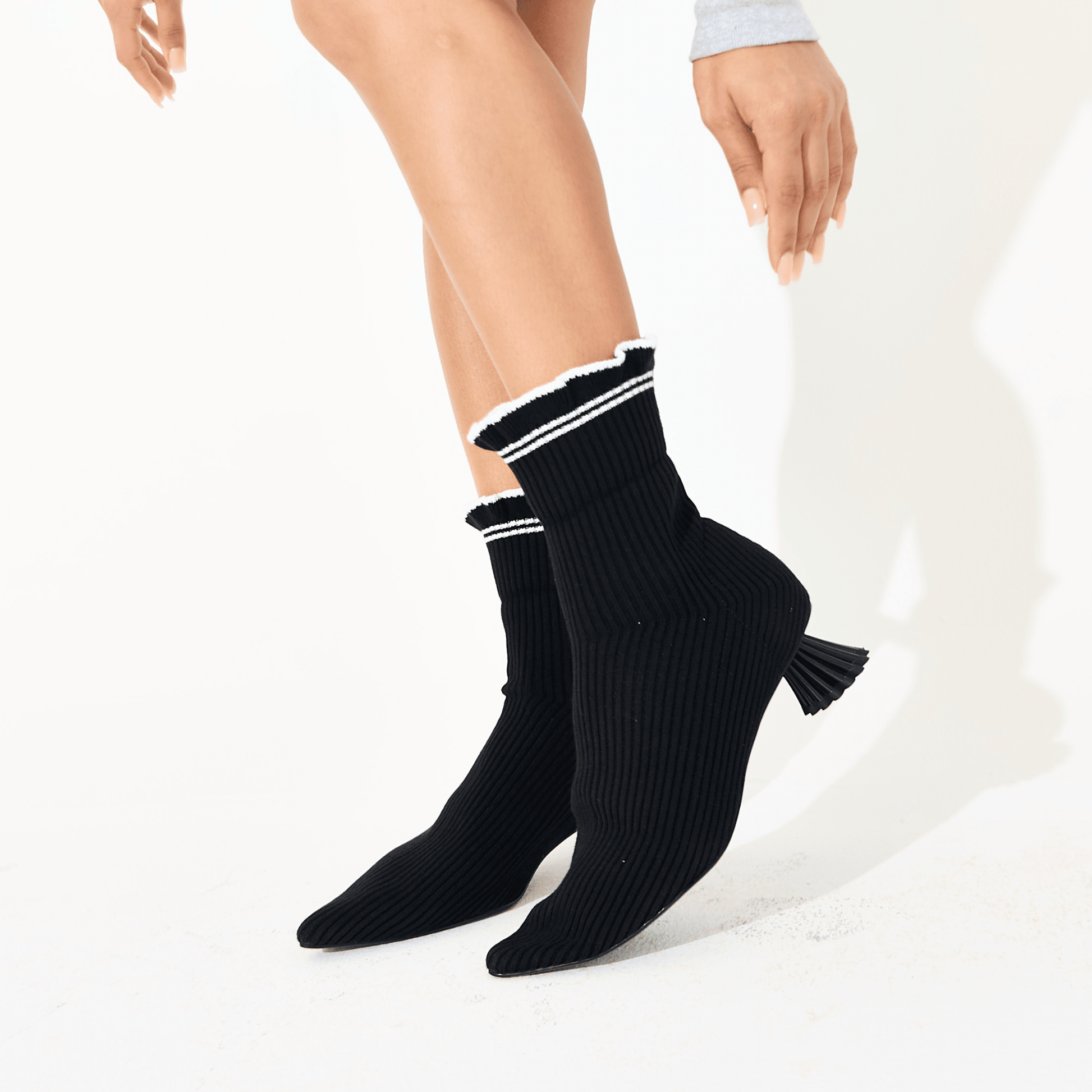 A ribbed knit bootie with a sculptural heel and flirty ruffle trim that brings vintage charm into modern focus. A statement piece that works with everything.