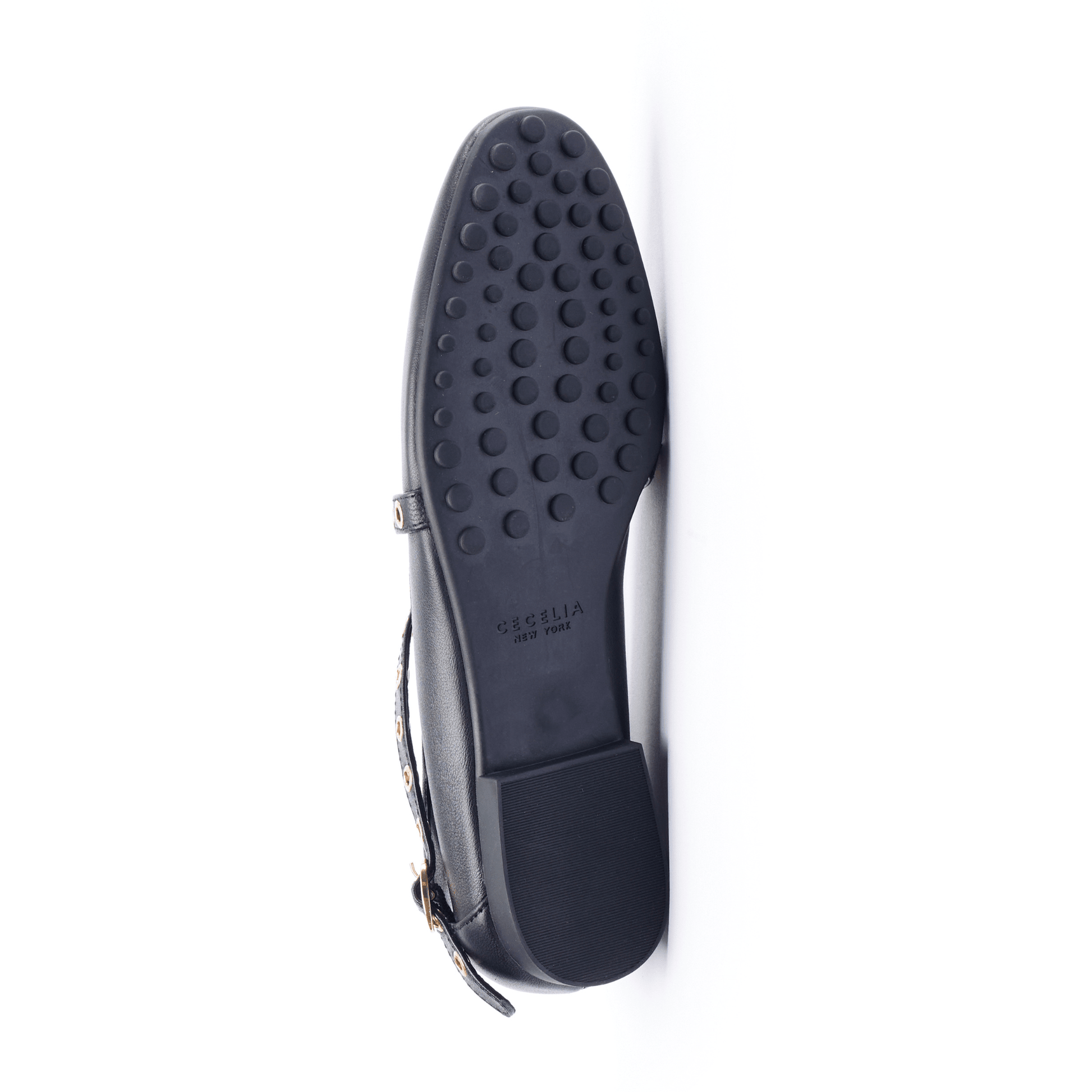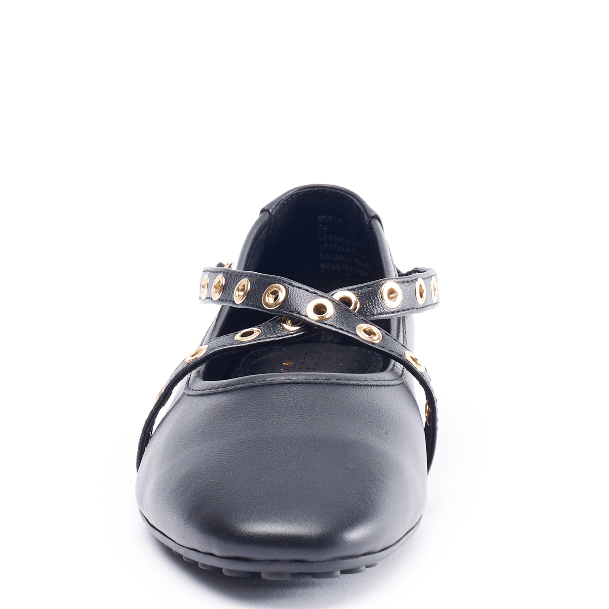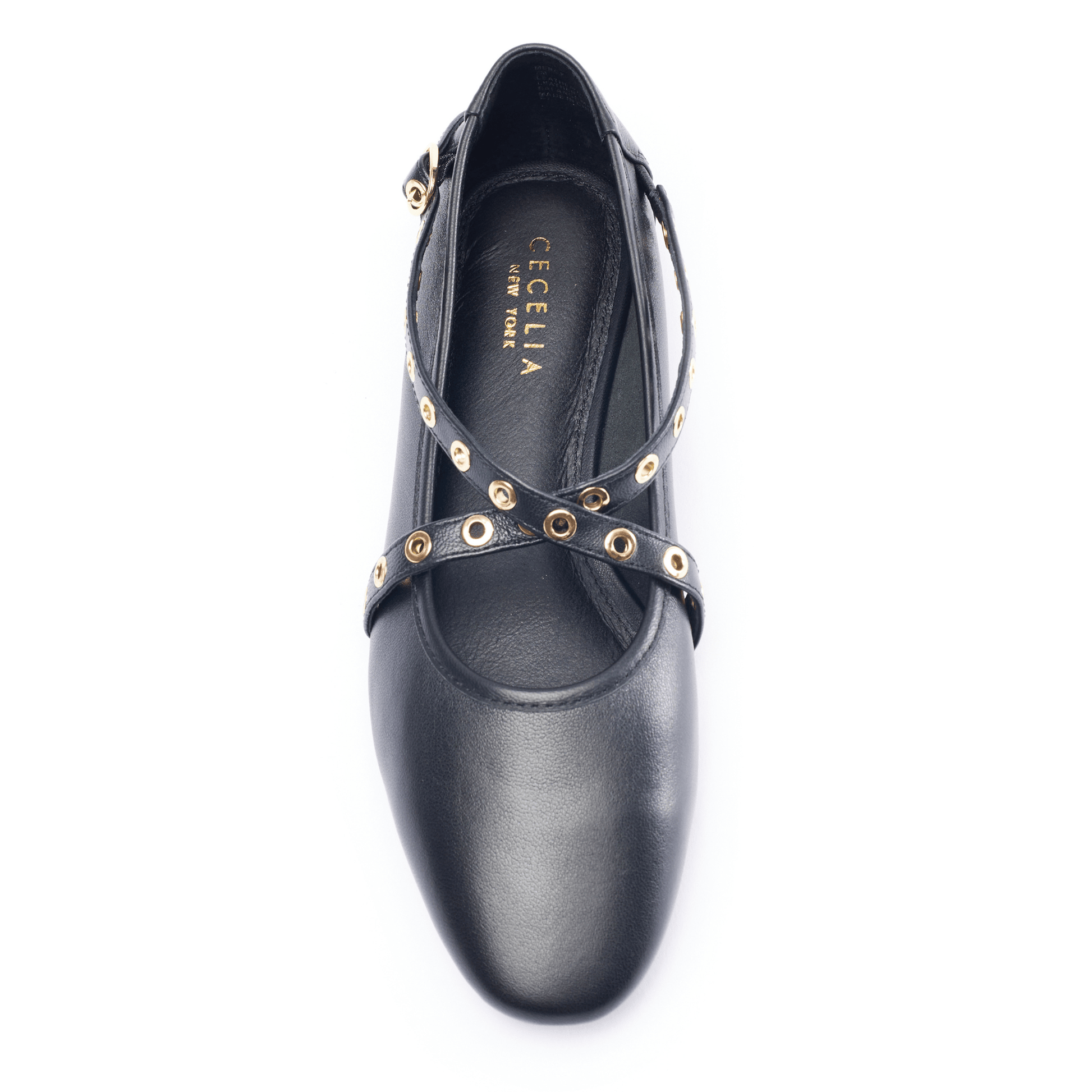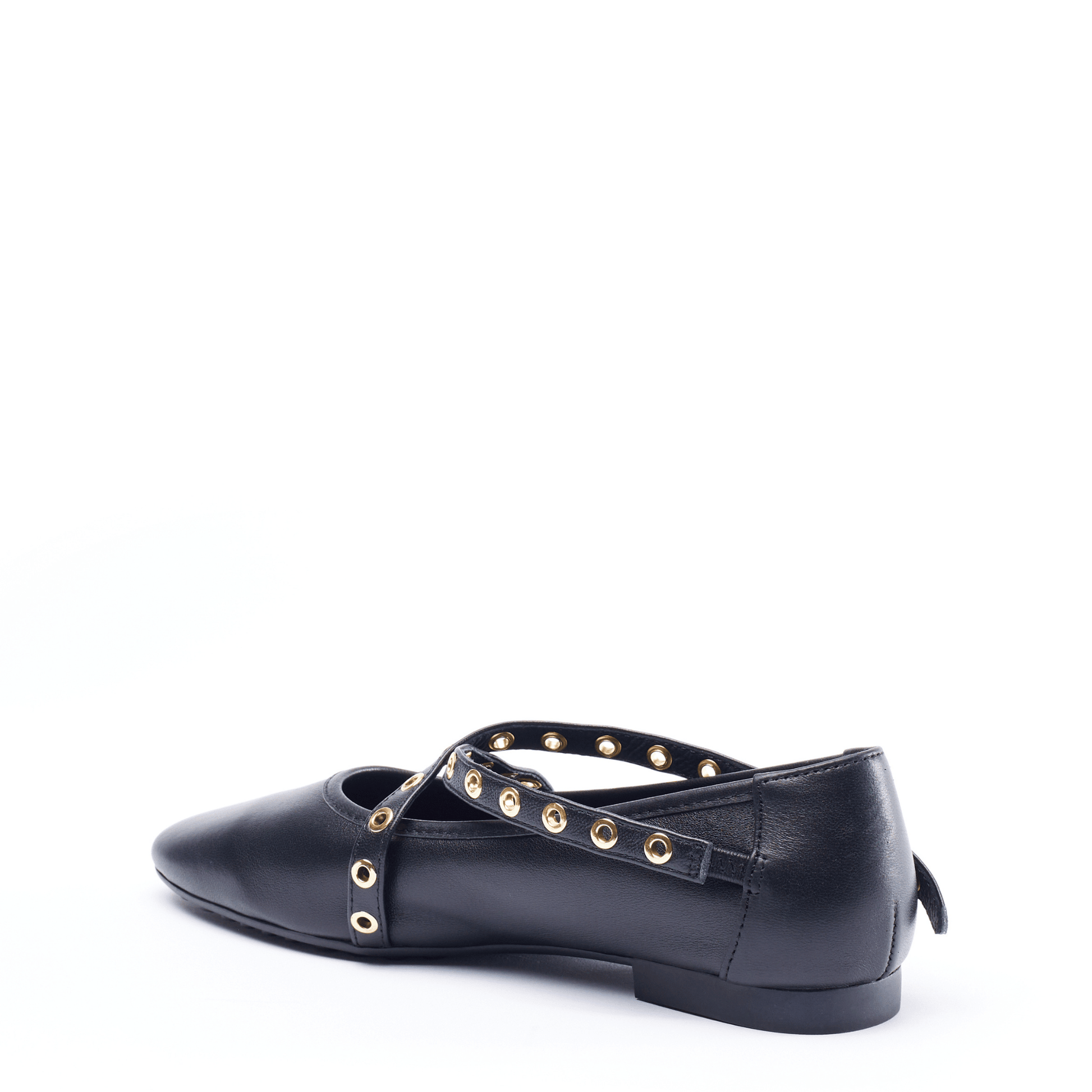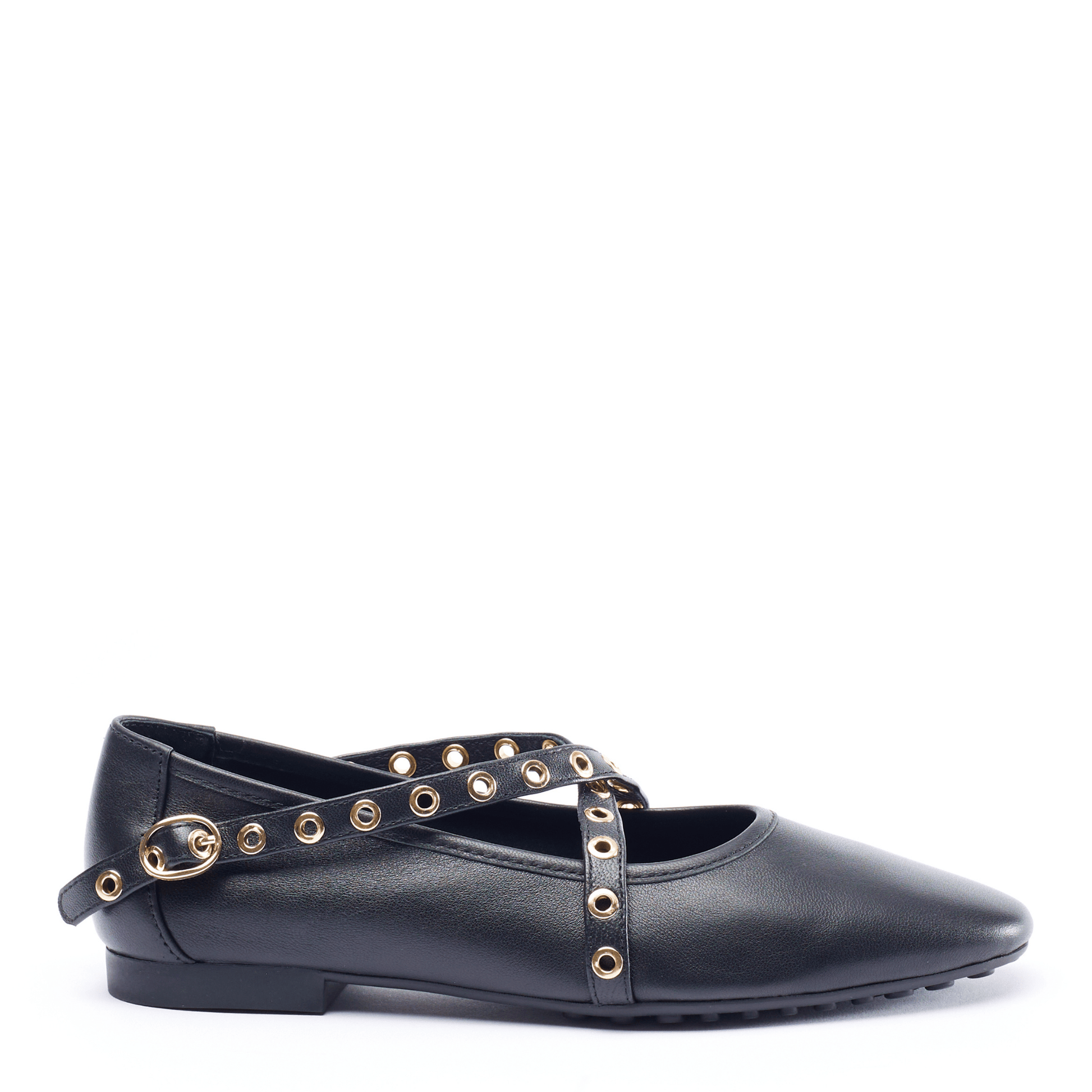 Buckled grommet-lined straps crisscross over the vamp of a striking leather flat fashioned with a Round toe for classic allure.