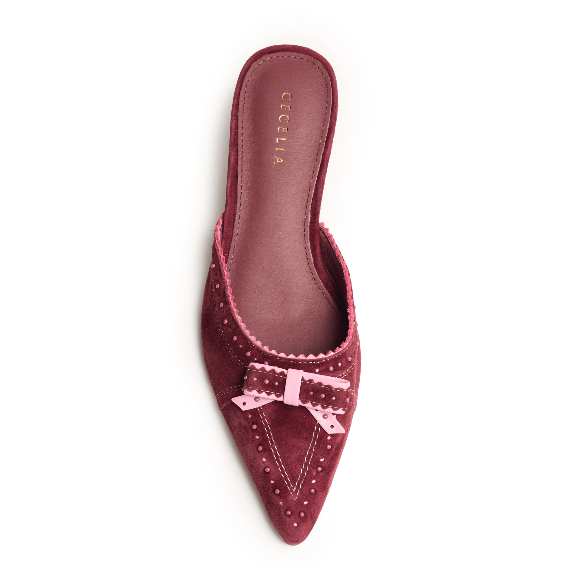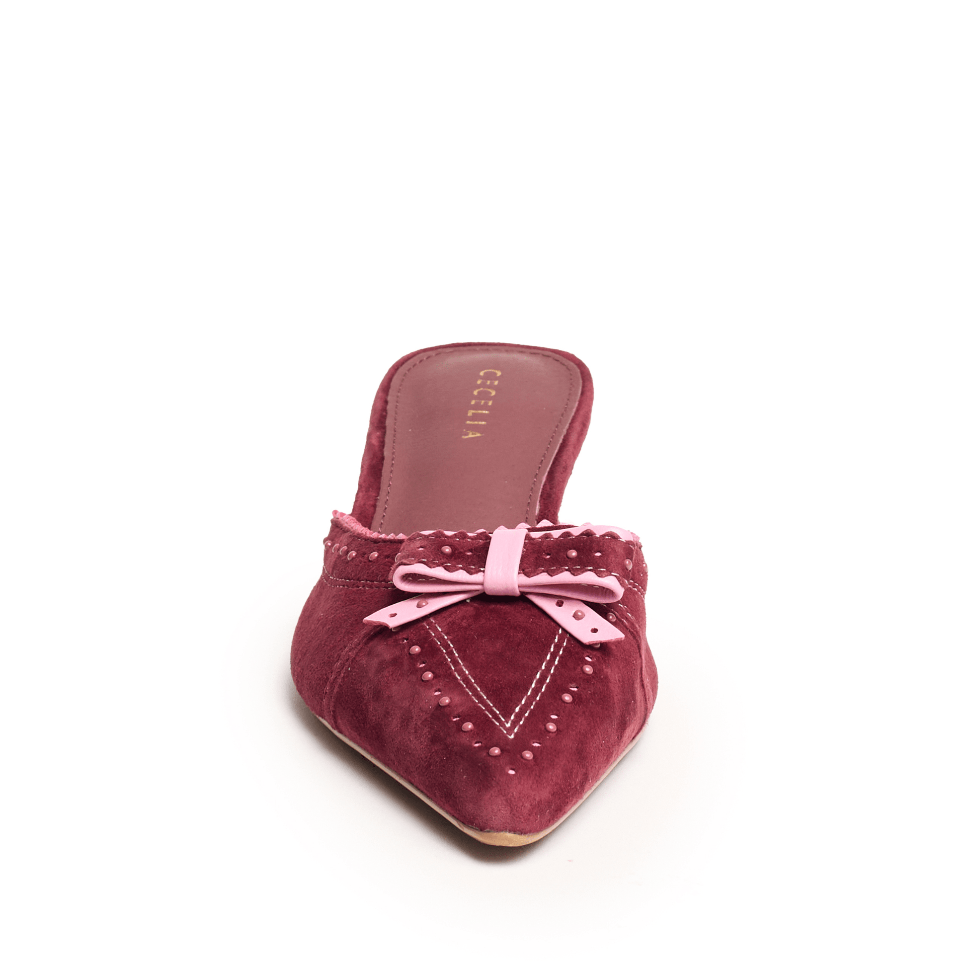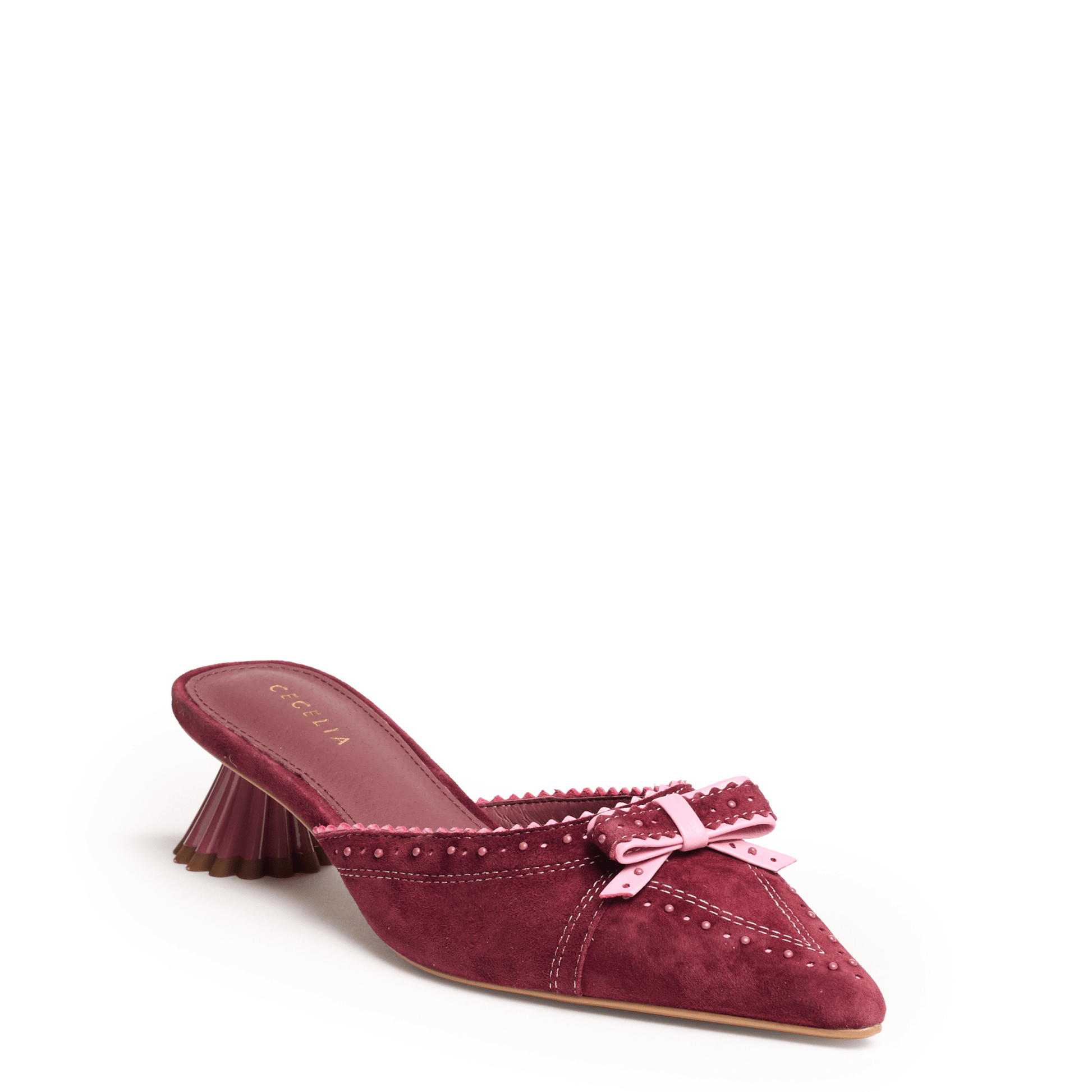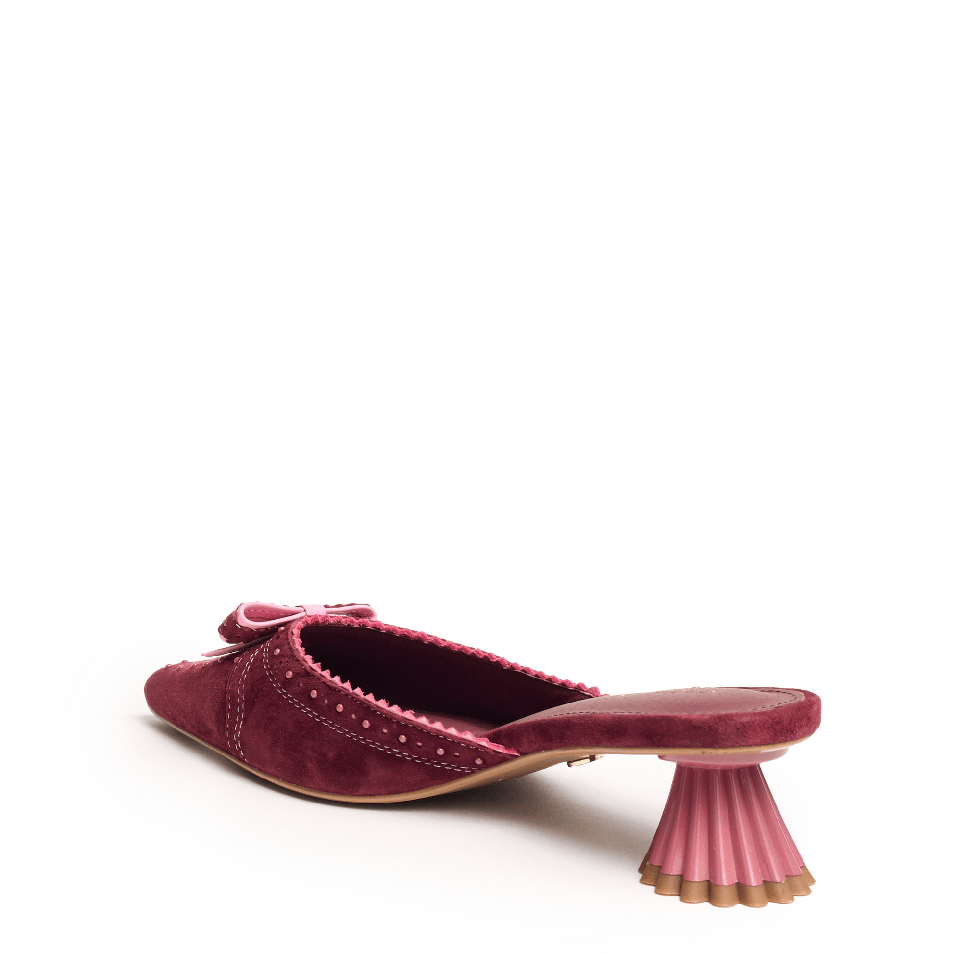 A modern mule with vintage notes. This style features a flared heel, delicate topstitching, and a small bow to finish the look. It’s refined with a wink.