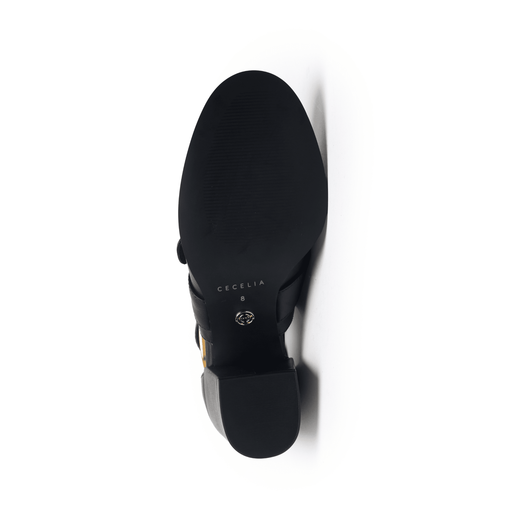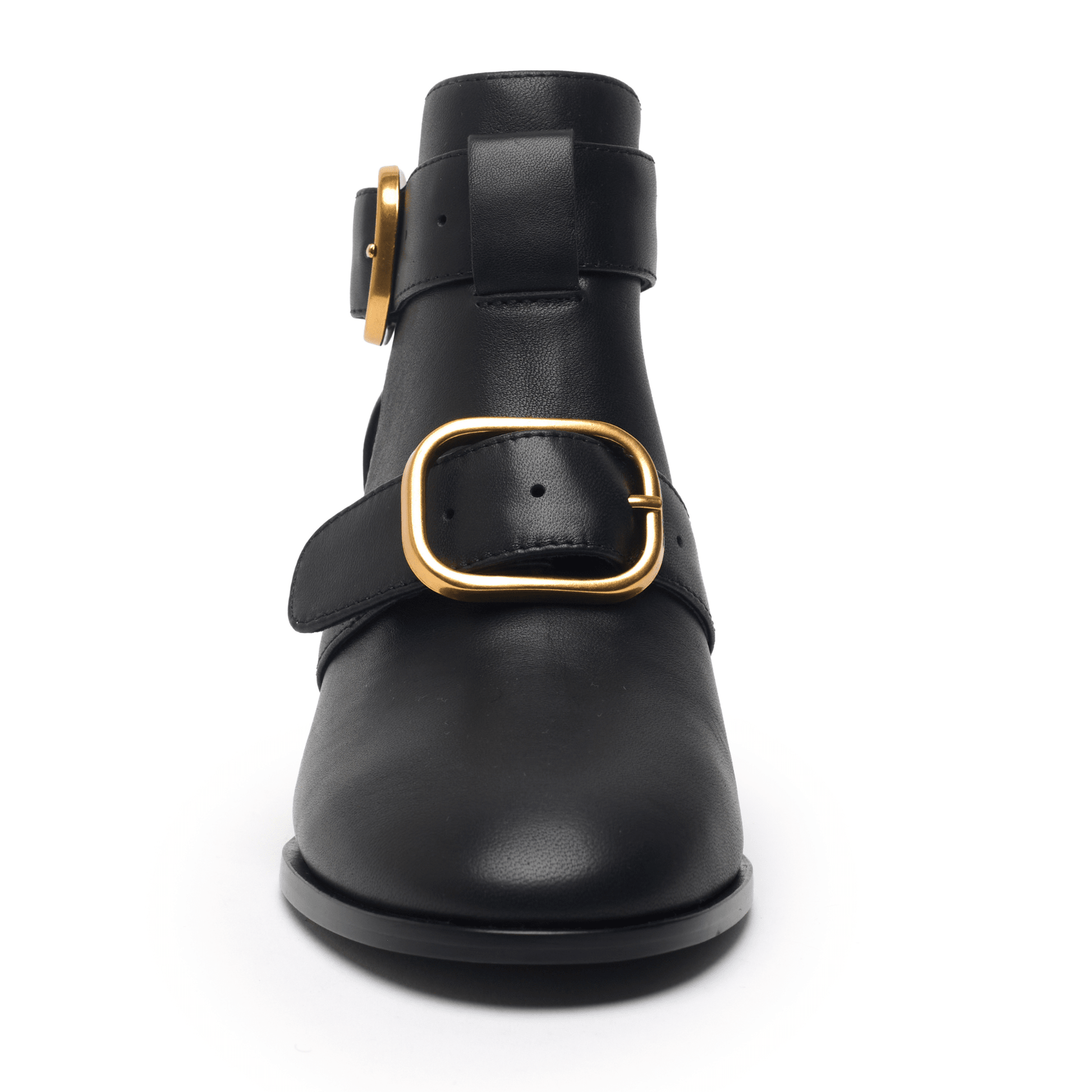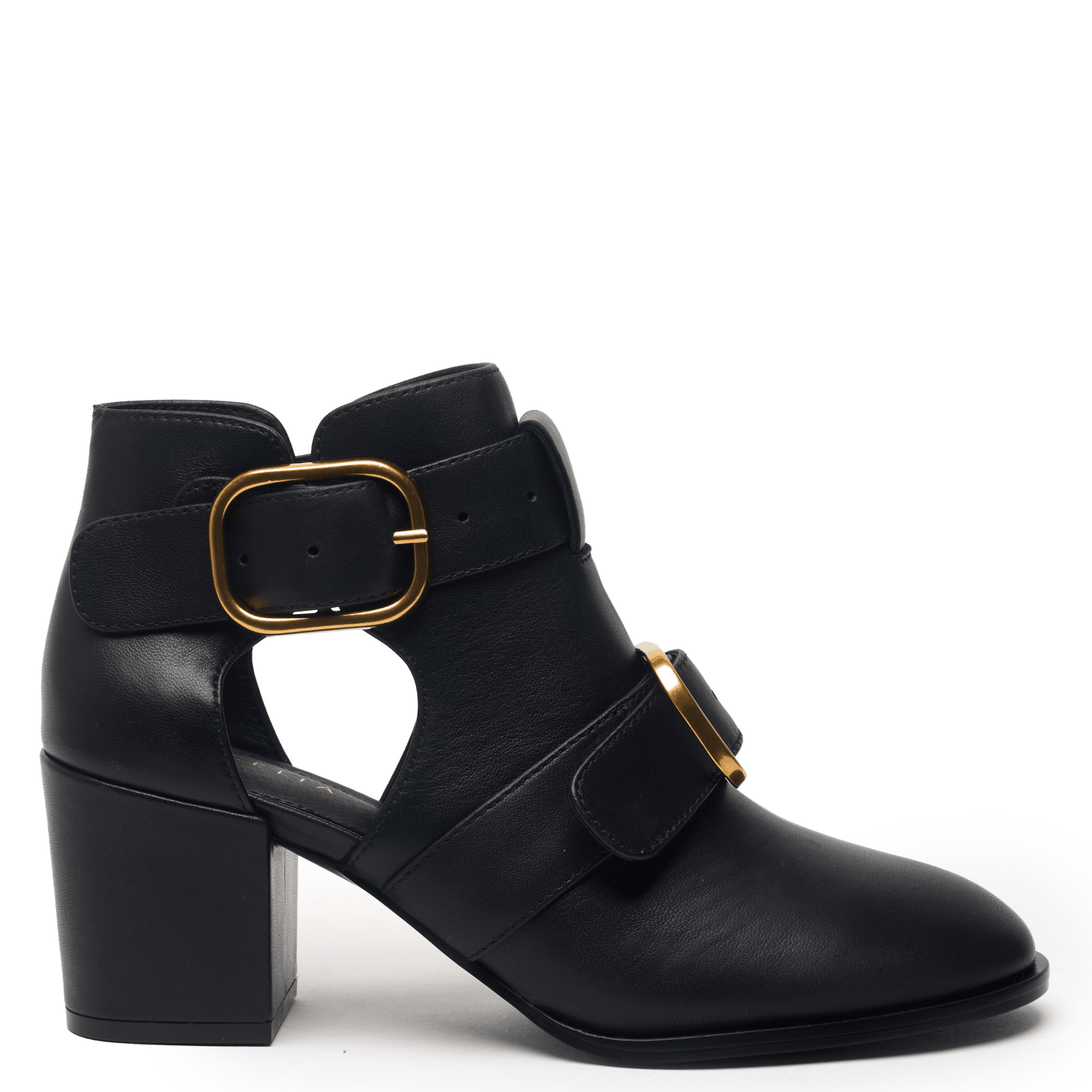Buckle up for a fun night in this striking Leather cutout boot, highlighted by bronze hardware and wide straps. A low block heel and a round toe make for street-chic style.