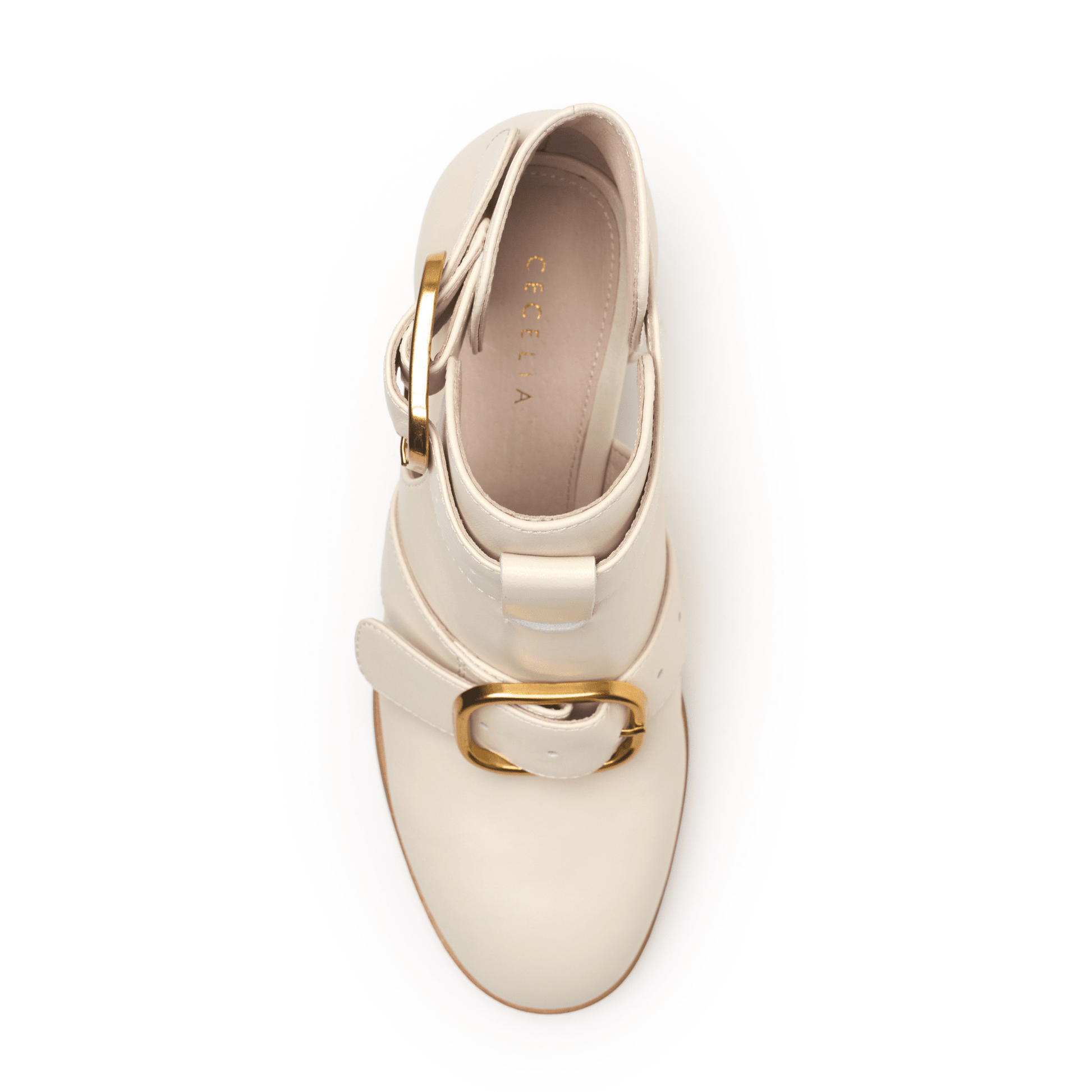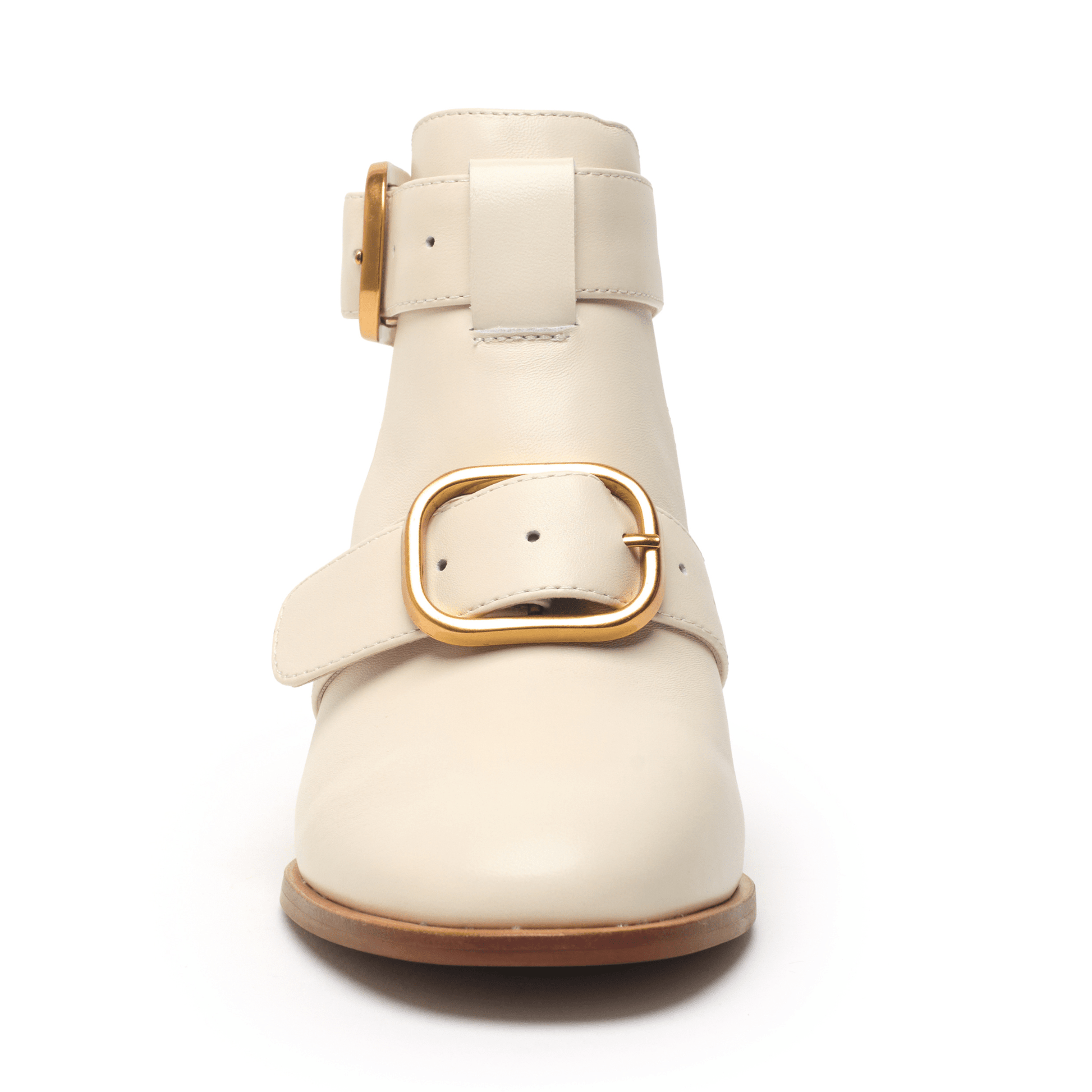 Buckle up for a fun night in this striking leather cutout boot, highlighted by gold hardware and wide straps. A low block heel and a round toe make for street-chic style.