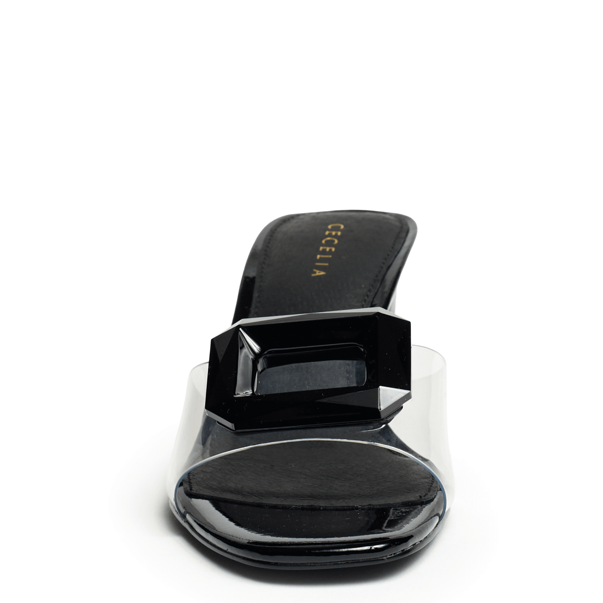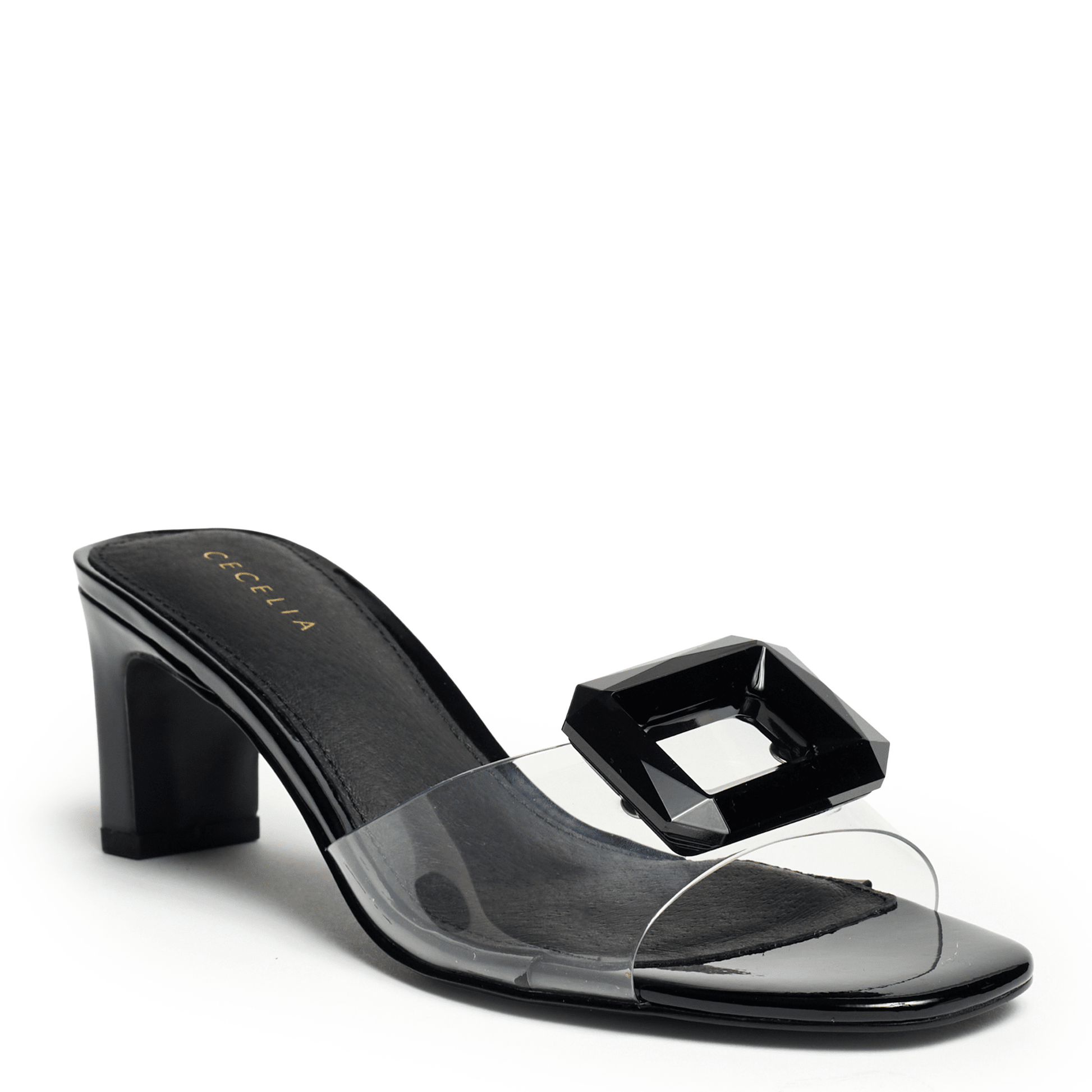 A jewel at the vamp of the PARK AVE JEWEL brings effortless glamour to a minimalist sandal framed by a squared-off toe and tapered heel.
