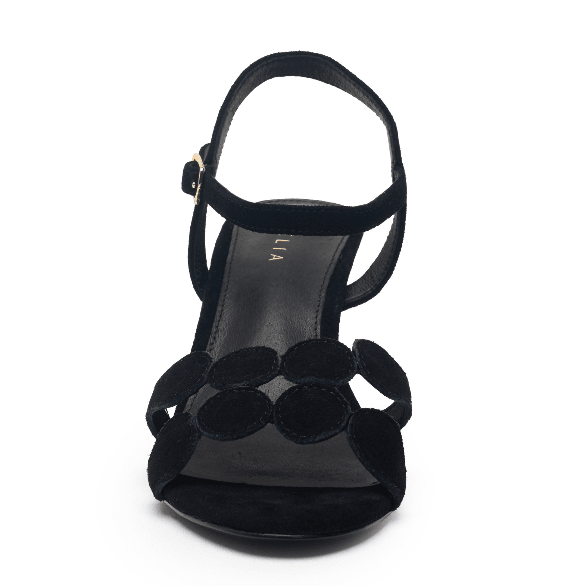 Medallion-inspired vamp straps create visual intrigue on a suede sandal balanced by a funky high shine heel.