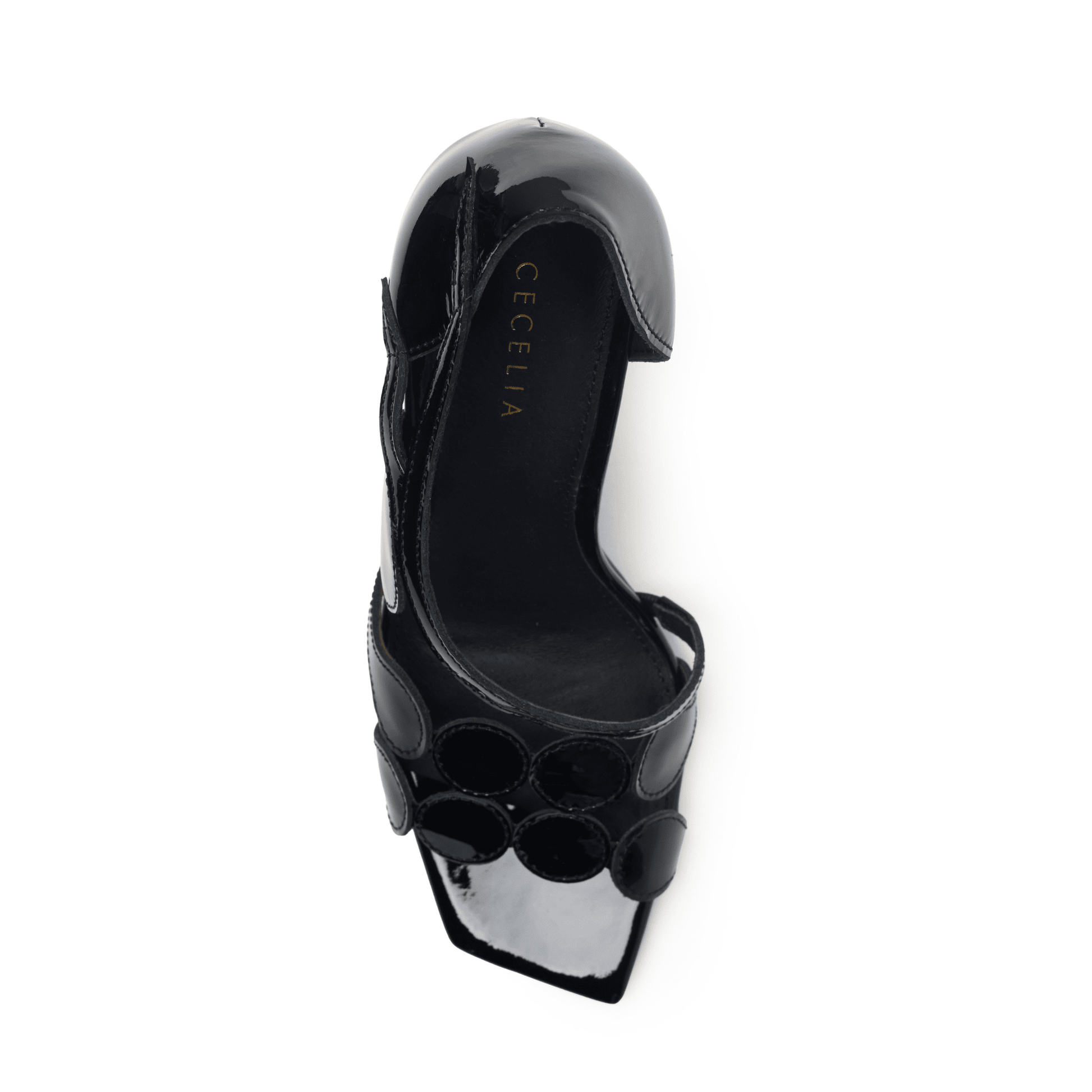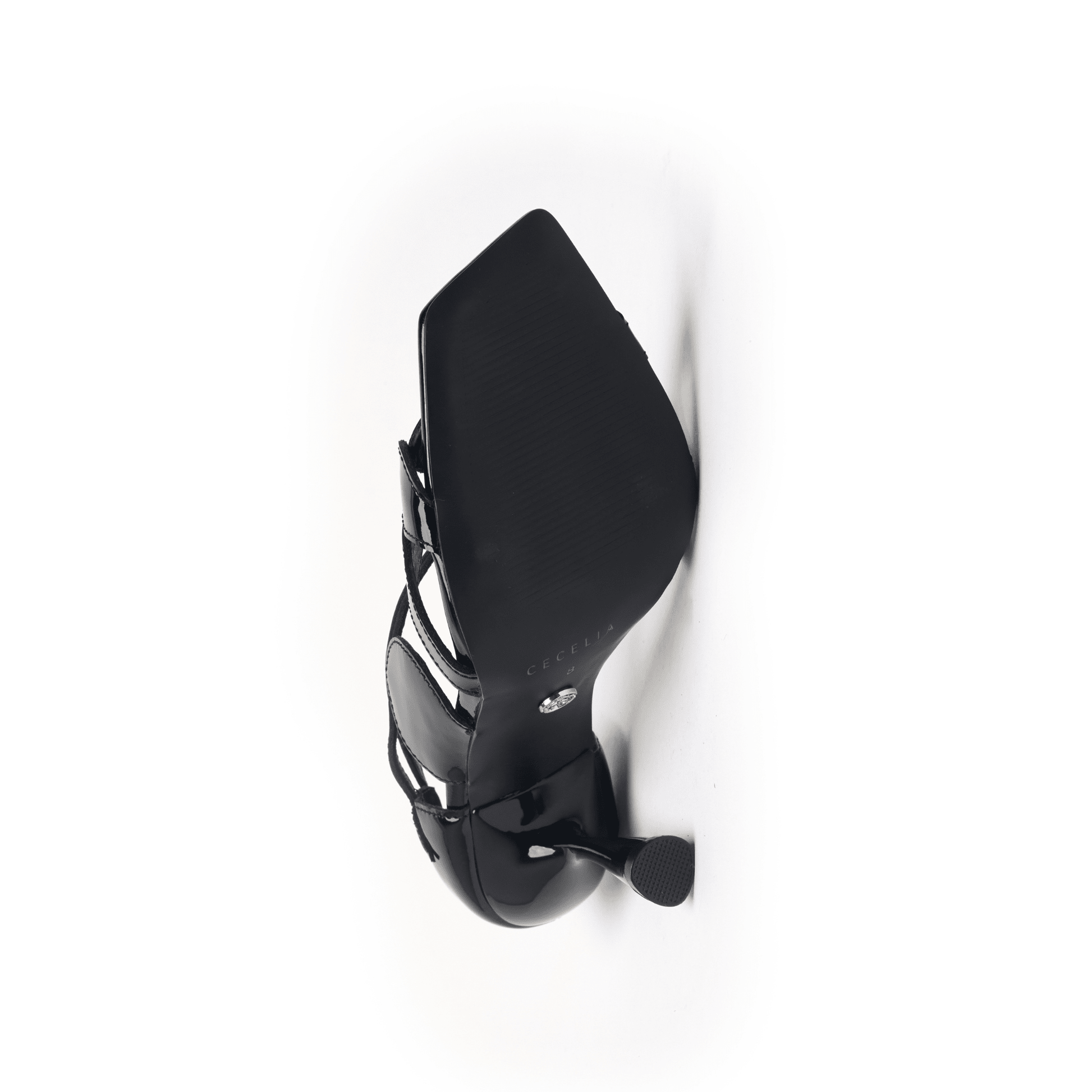 Medallion-inspired vamp straps create visual intrigue on a patent leather sandal, balanced by a s sleek tapered heel.