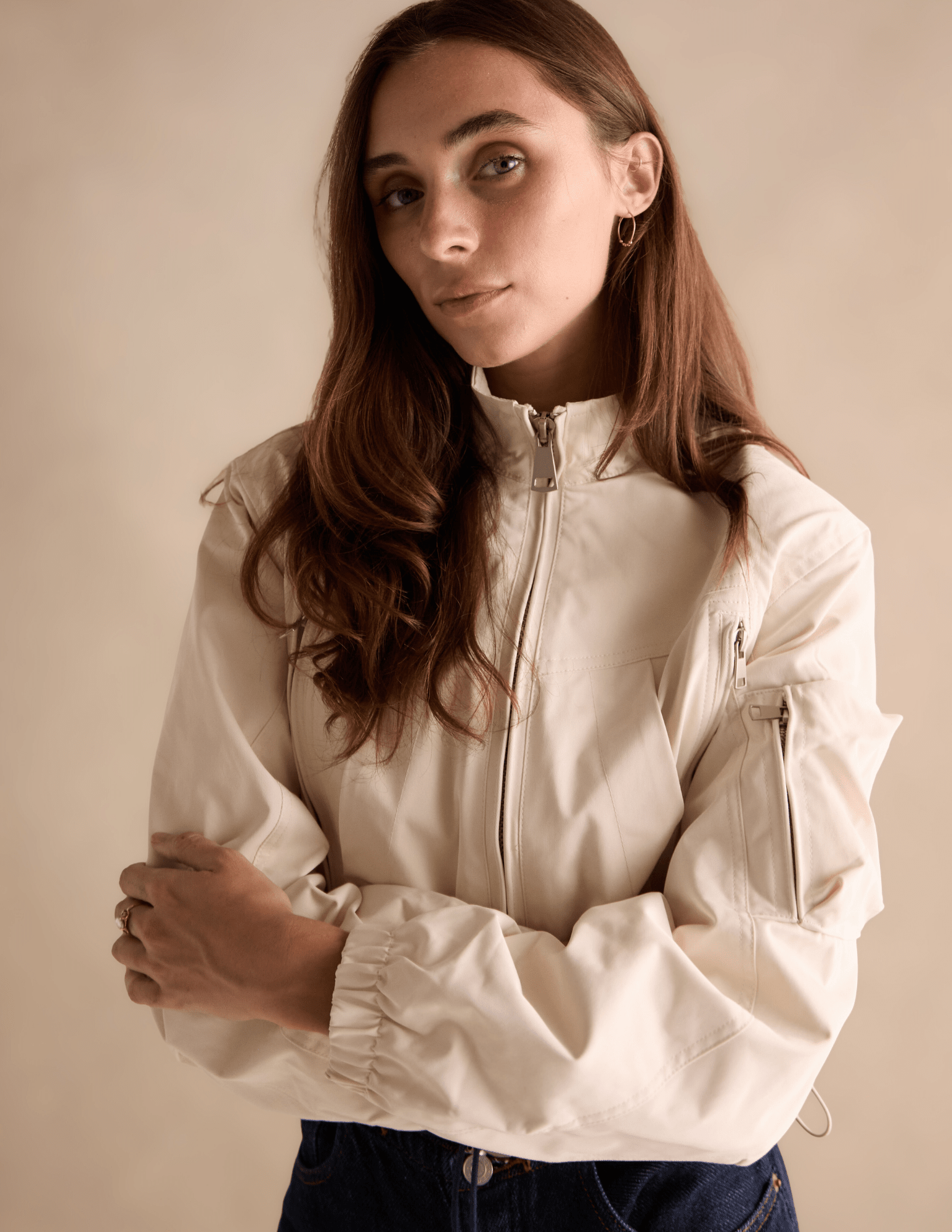 The Tay jacket is a modern essential designed with intention and versatility in mind. Crafted in a clean, neutral tone, this cropped silhouette features a structured high neckline, subtle seam detailing, and functional zip accents that add a refined edge. A lightly cinched hem creates shape while maintaining an effortless, wearable feel.