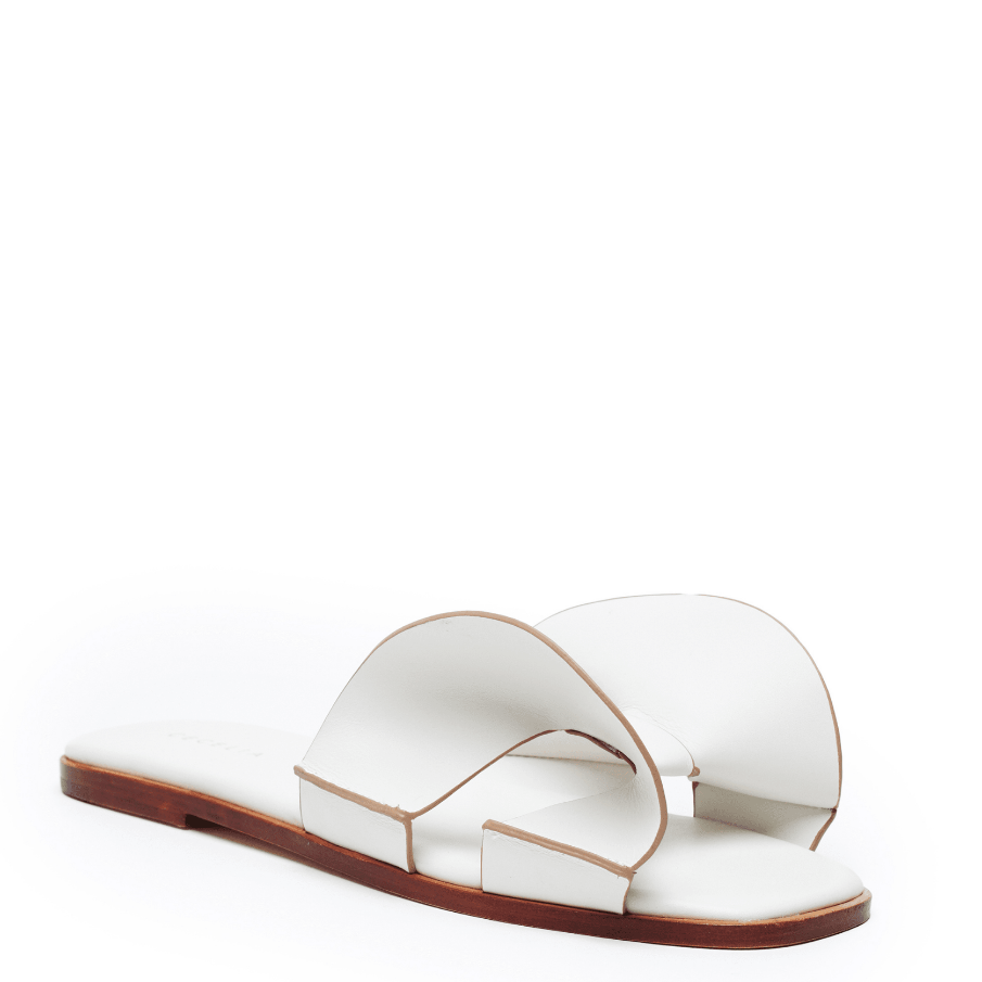 Refined simplicity defines this elegant slip-on sandal, designed to bring effortless polish to warm-weather dressing. Clean, sculptural straps create a modern silhouette that feels understated yet sophisticated, making it an easy complement to sundresses, relaxed tailoring, and everyday summer styling.